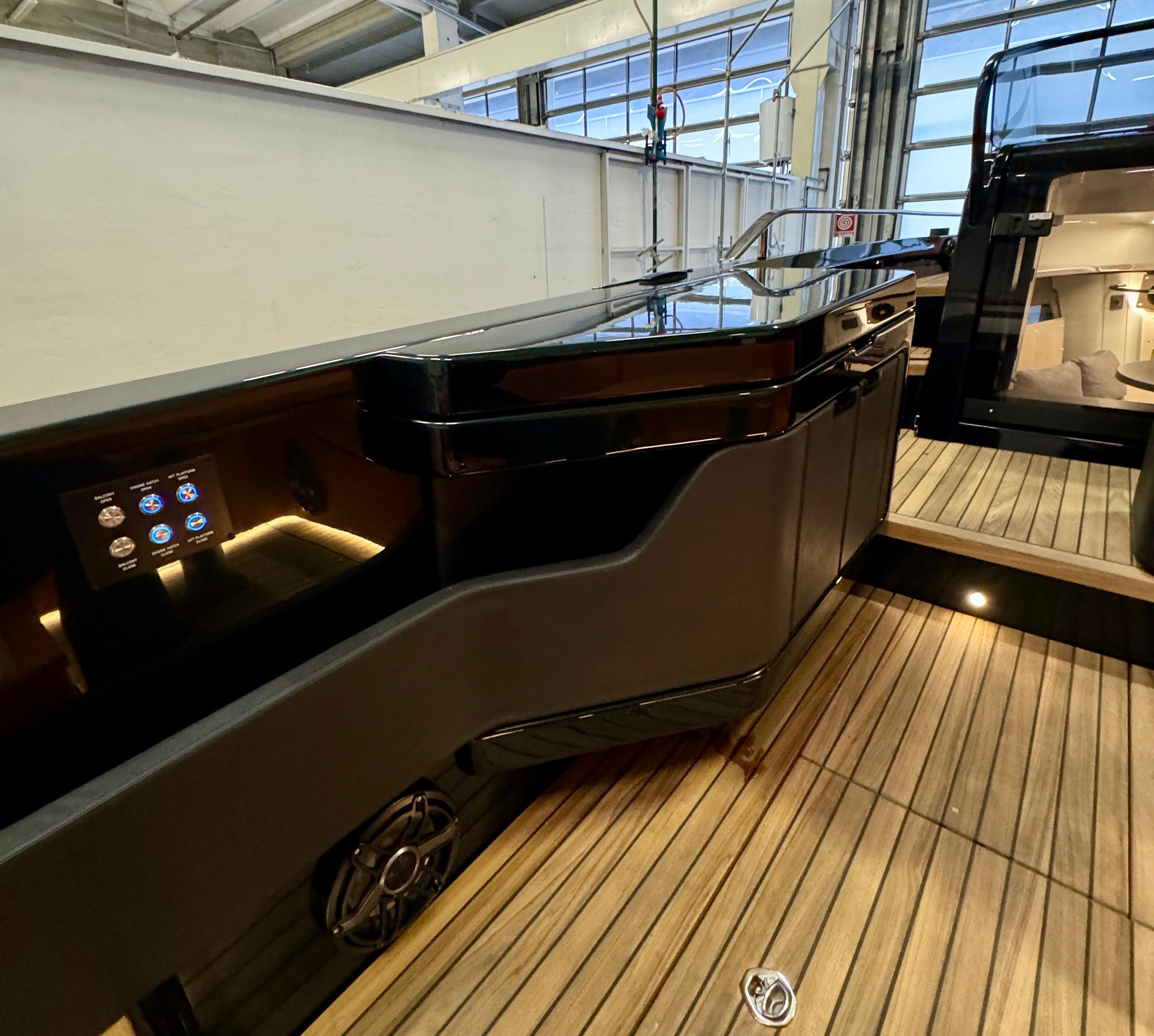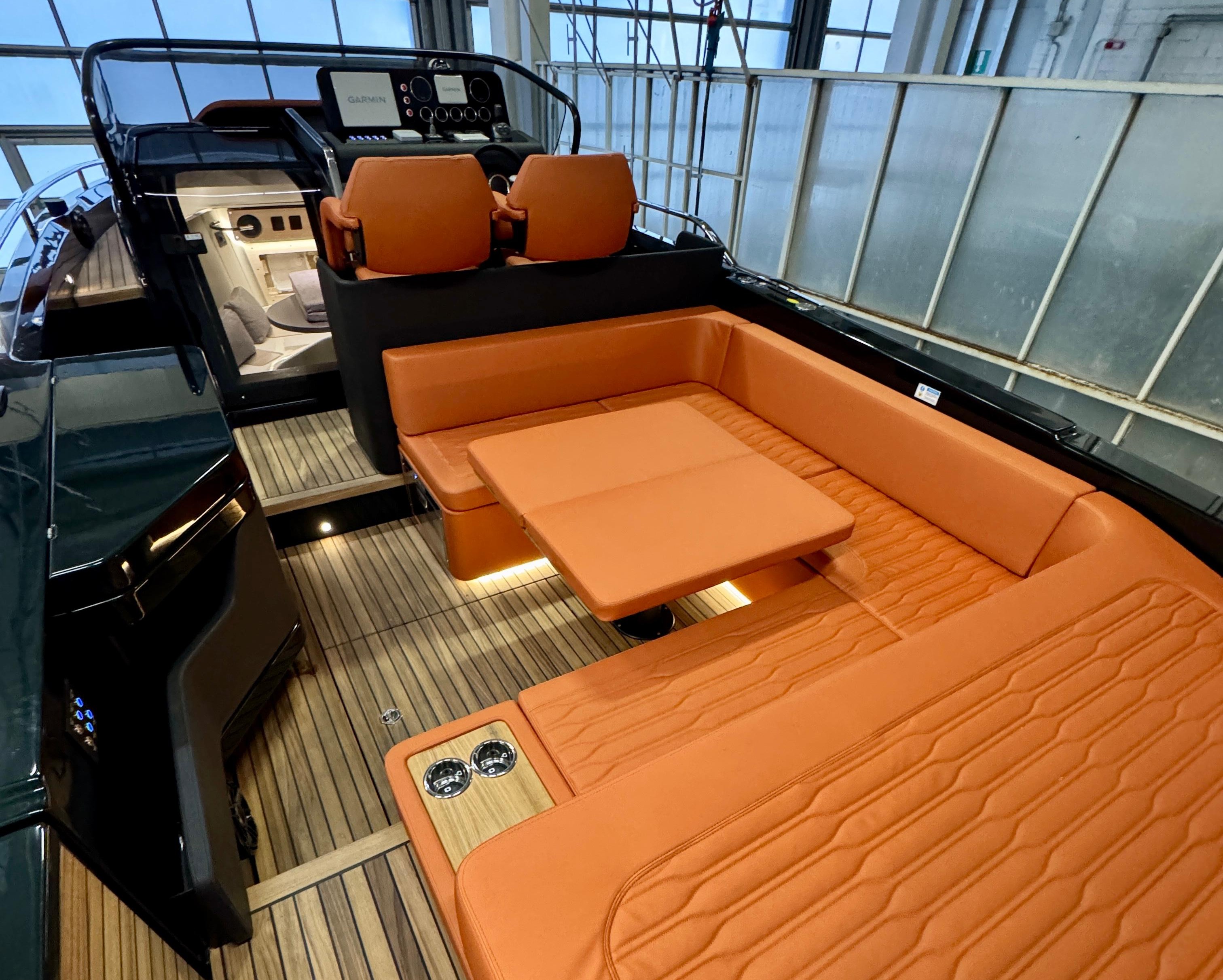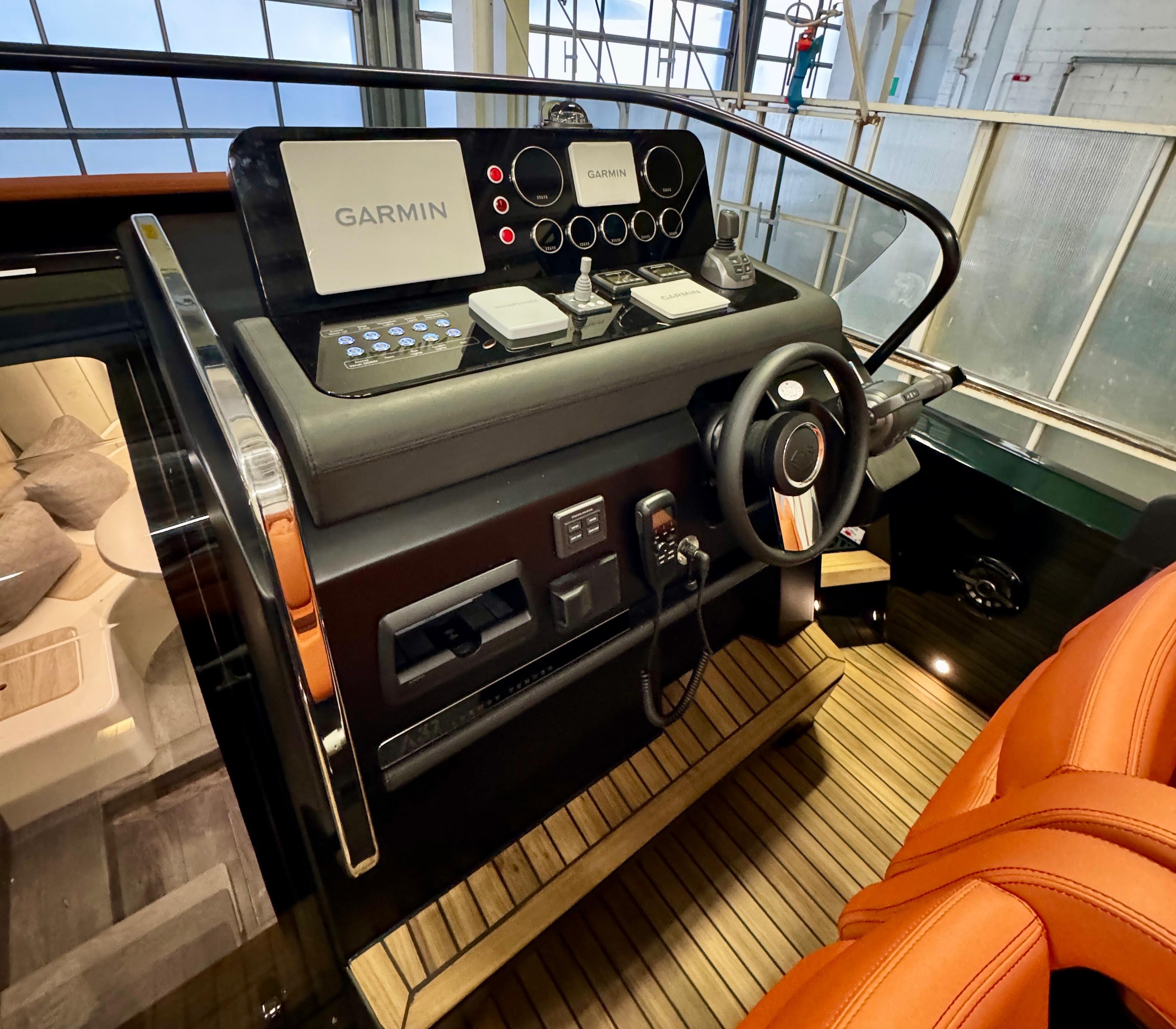 Joystick + Cruise control + Single lever control + Trip computer + Power trim assistance + Joystick docking - Dipòsit d'aigües negres - Antifouling color negre - Antifouling especial PropSpeed per hèlix - Aire condicionat 10.000 BTU 220 V - Capota completa amb capota sol (sense T-Top) - Cobertures per quadre de comandaments i seients pilot i copilot - Matalàs de proa amb cobertura - Hèlix de proa - Nevera a la cabina 90 l - Nevera a la banyera 35 l - GPS/Chartplotter de color 10" - Generador 3 kW - 3 Llums subaquàtiques - 6 Defenses i fundes - Pilot automàtic Garmin - Plataforma de popa: extensió electrohidràulica - Púlpit a proa - Suplement ràdio: JL per sistema d'audio exterior amb 2 altaveus a proa, 4 altaveus a la banyera, amplificador, subwoofer i 2 altaveus a la cabina - Superfície de teka trancanils laterals - Plataforma de popa en teka - Teka a l'entrada de la banyera i al lateral plegable - Banyera en teka a la zona de conducció - Comandament a distància molinet amb compte-metres cadena - Lona de fondeig - Molinet elèctric 800 W, cadena de 50 m i àncora de 16 kg Ultramarine en acer inoxidable - VHF - Còpia certificat CE i declaració de conformitat - Capota (color alternatiu a l'estàndard) - Cobertures defenses (color alternatiu a l'estàndard) - Interiors en fusta Dark Grey 11.11 - Sòl interior en dogues de roure - Tapisseria exterior Silvertex (color alternatiu a l'estàndard) - Casc i coberta lacats - Preparació, botadura, lliurament i prova de mar - Tranport drassana a Costa Brava.