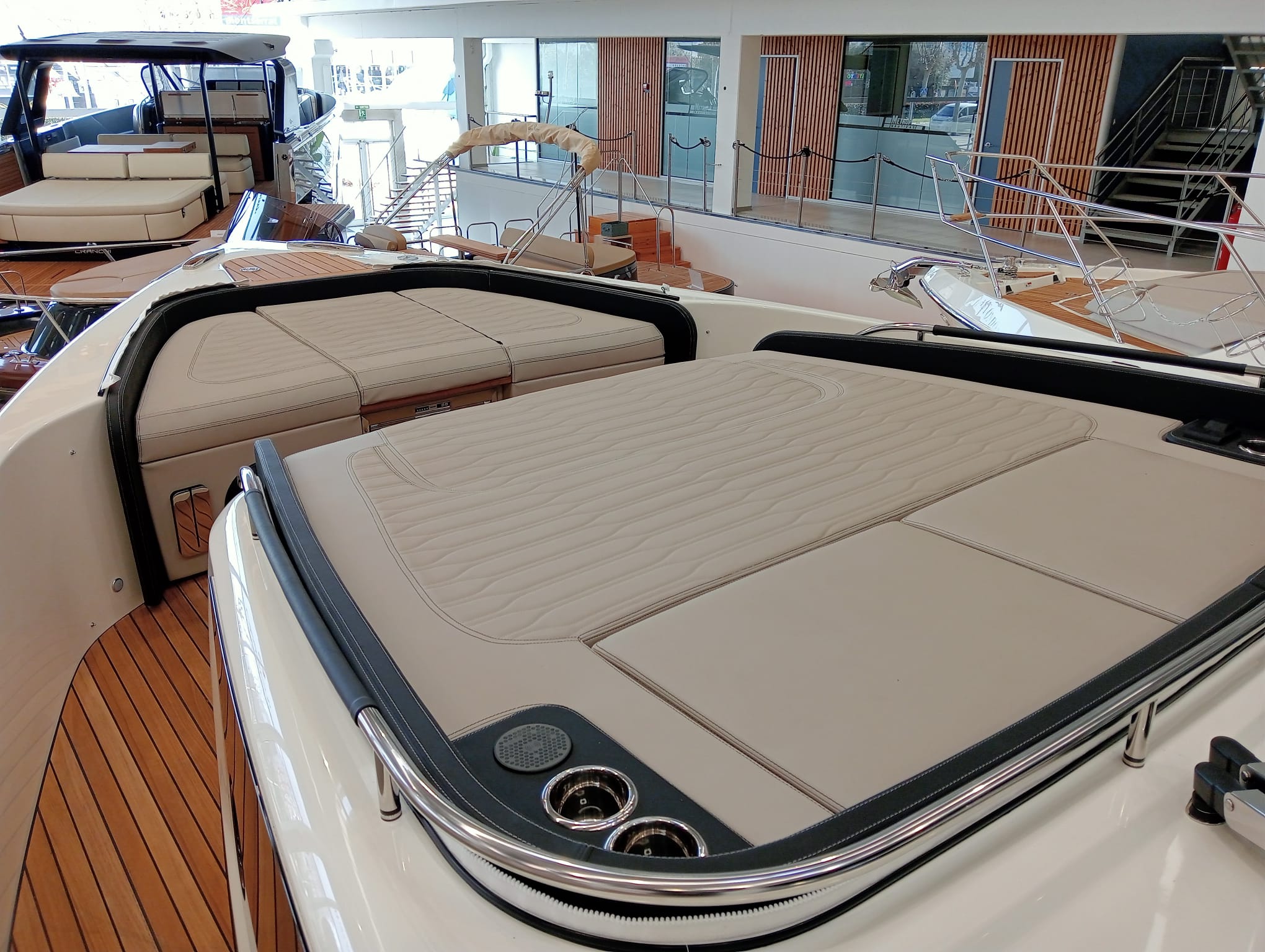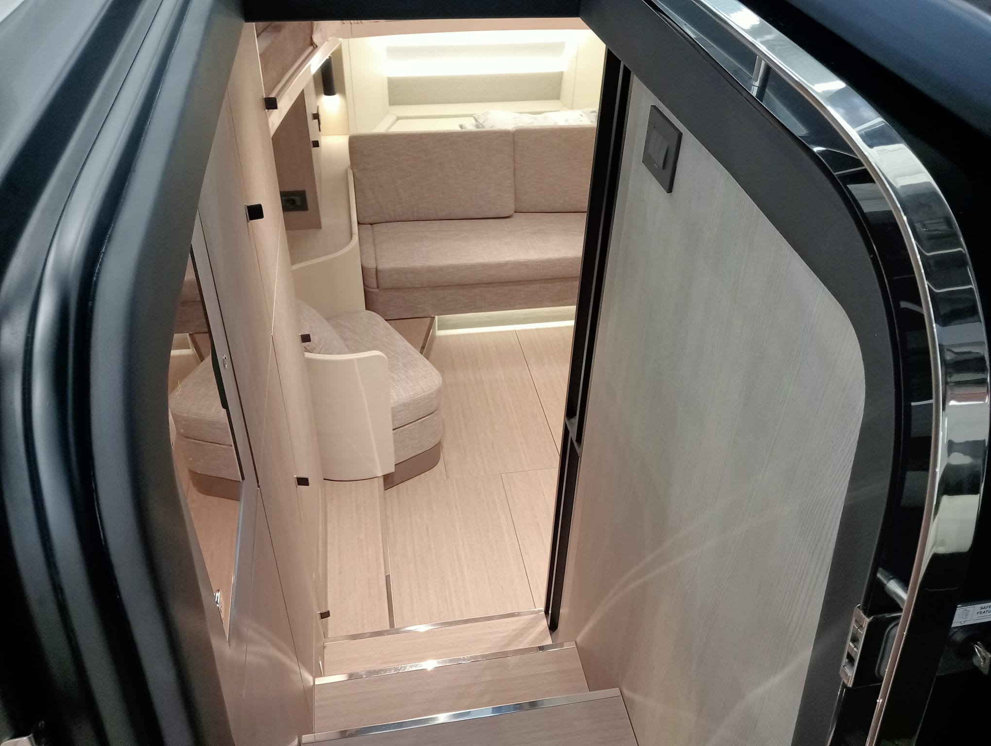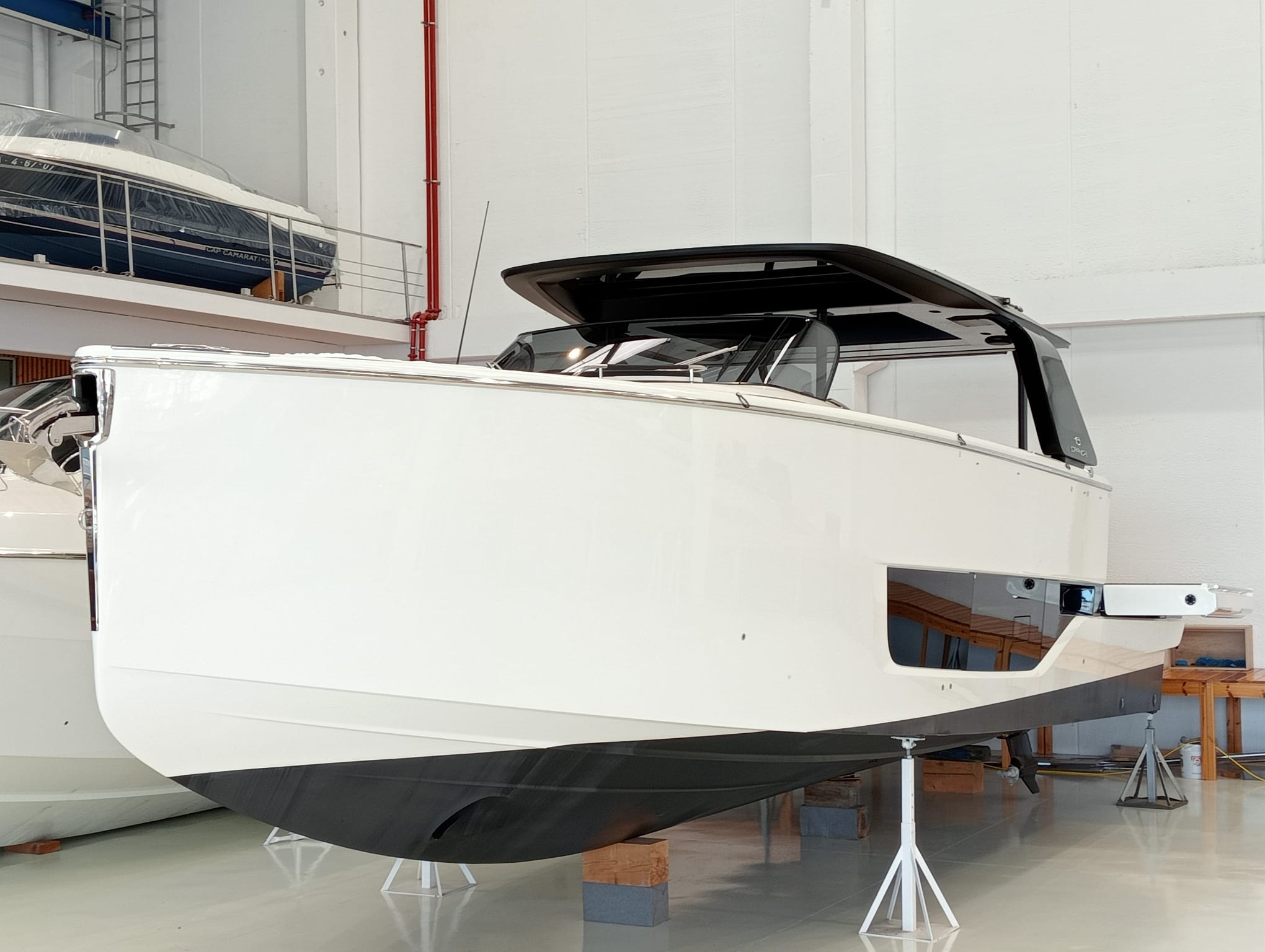 Embarcació en stock. Lliurament immediat. Model A 46 Luxury Tender de la prestigiosa drassana italiana Cranchi de 14,25 metres d'eslora total. Barca amb hard top i gran solàrium de popa. Interiors de disseny modern i gran habitabilitat.