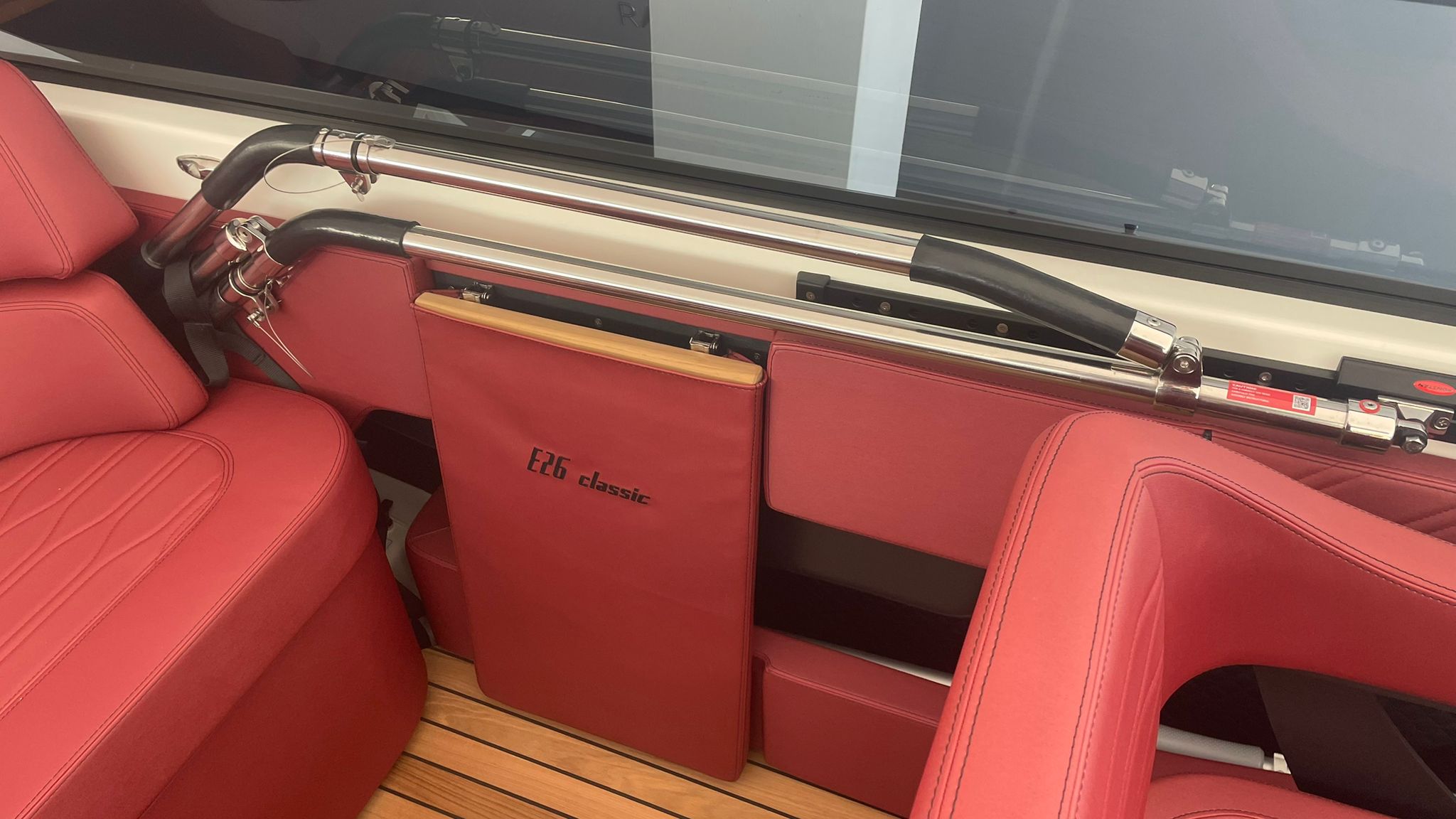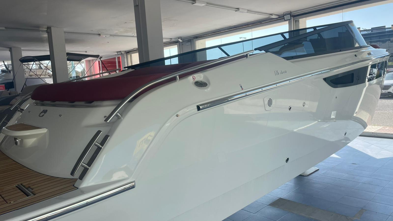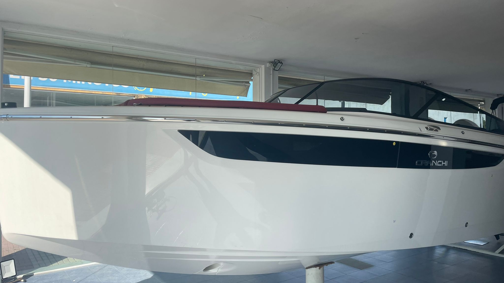Embarcació en stock. Lliurament immediat. Fotos d'arxiu, els colors i l'equipament poden no correspondre a la unitat oferta. Model E 26 Classic de la drassana italiana Cranchi de 7,85 metres d'eslora total. Vaixell amb còmoda plataforma de bany, distribució espaiosa, amb cabina i solarium a popa.