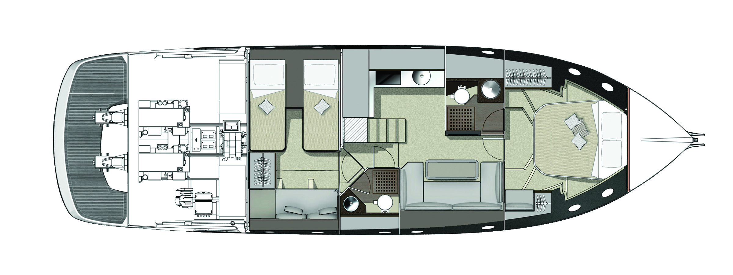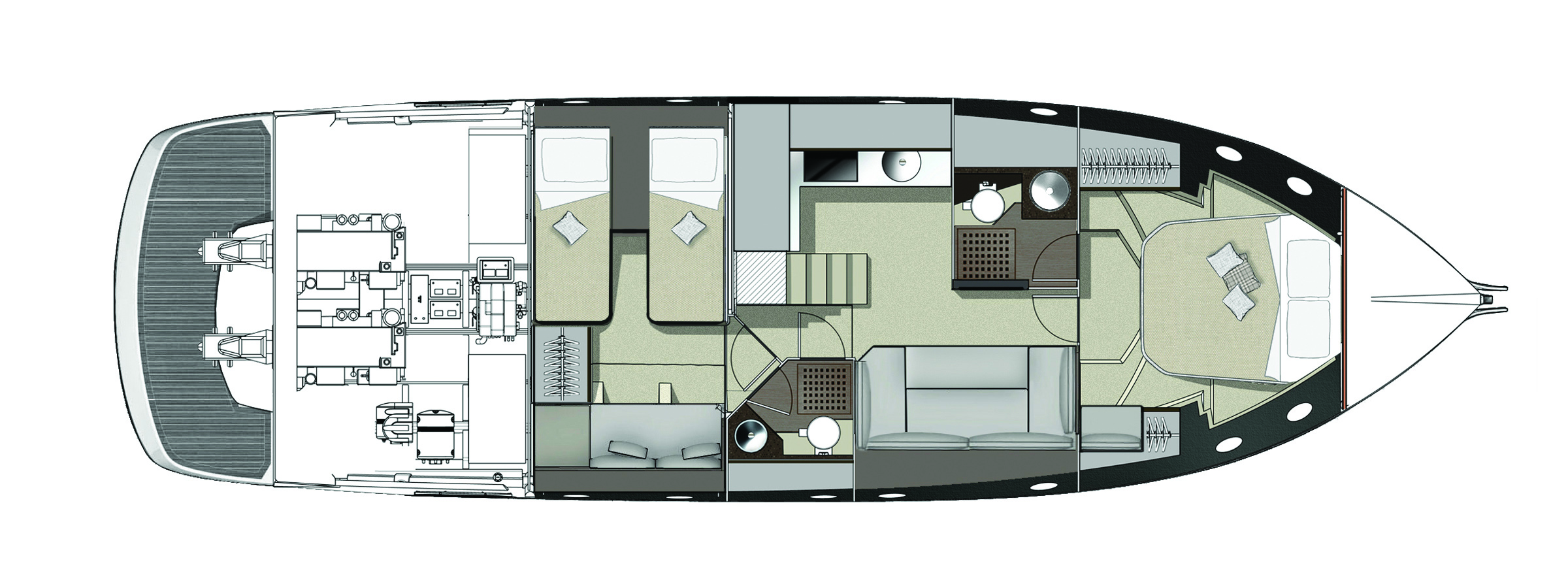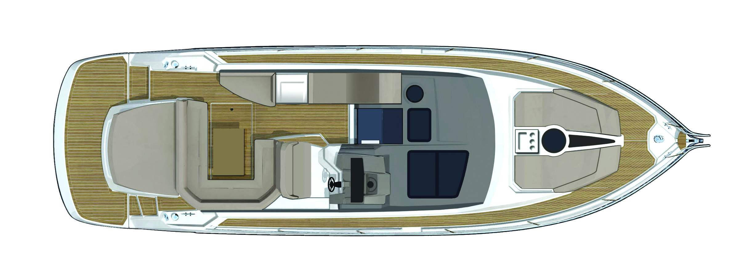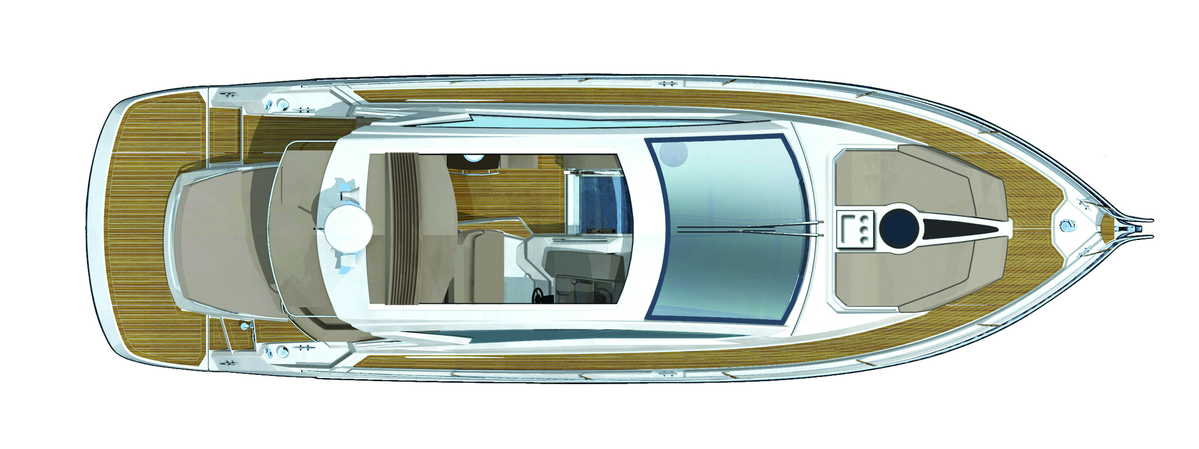 Embarcació amb hard top i sostre corredís de tela. Els grans espais interiors que inclouen 2 cabines, 2 banys, una cuina i un saló proporcionen una immediata sensació de confort i benestar. La banyera té una capacitat excepcional, amb 2 places en el pont de comandament, un divan a babord, un ampli sofà, un moble-bar i un gran solàrium de popa sota el qual està ubicat el garatge per a la pneumàtica auxiliar.