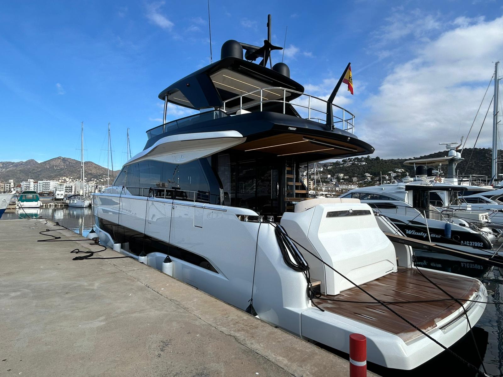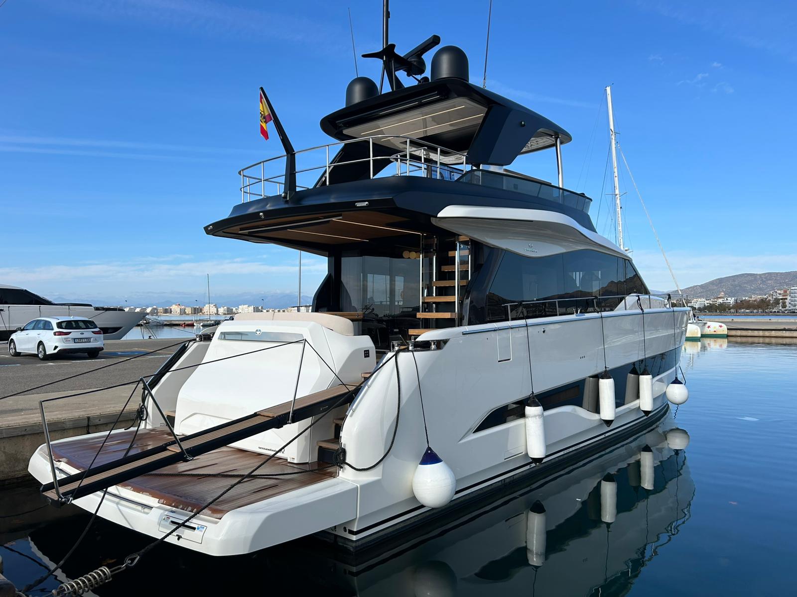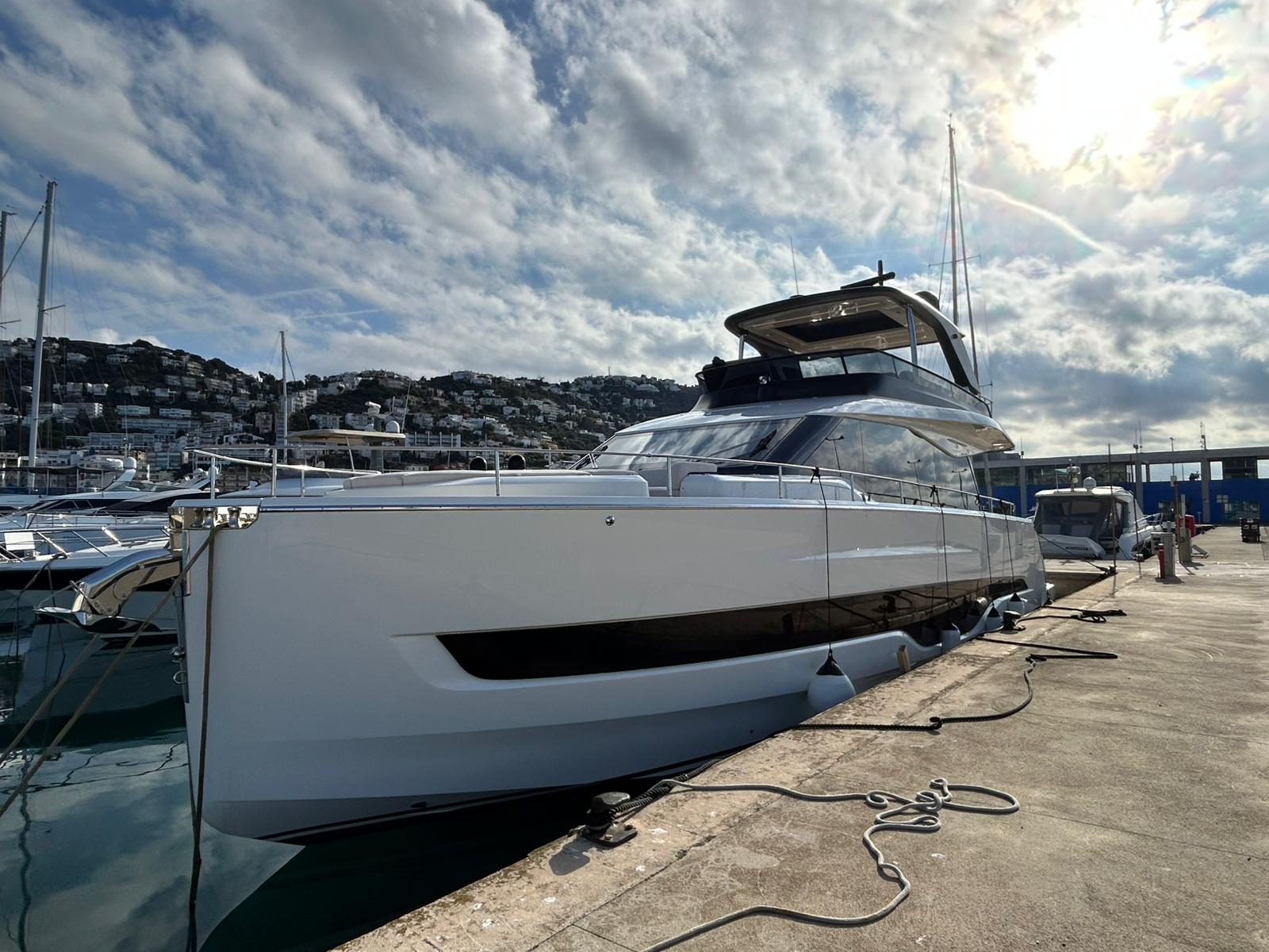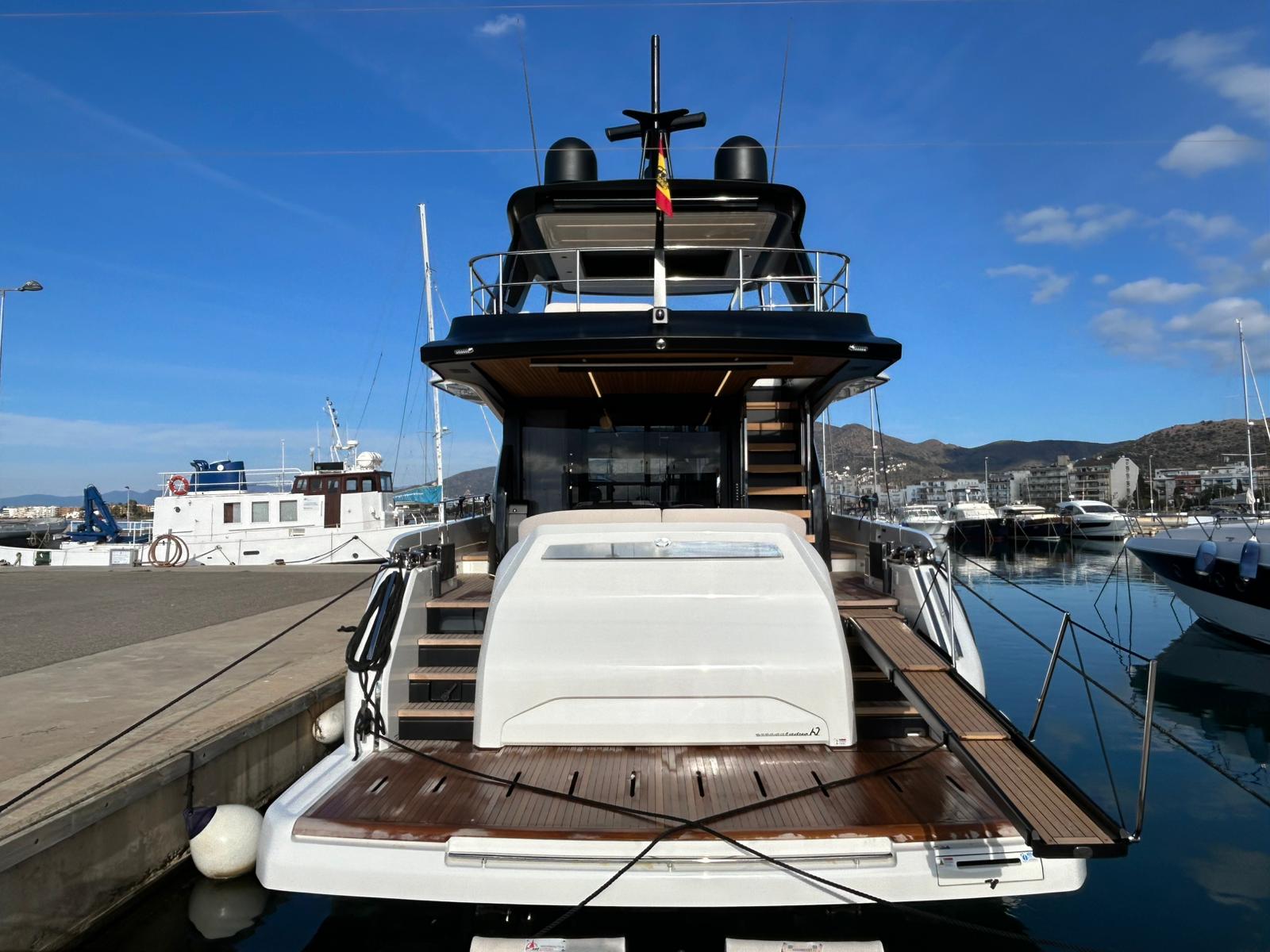 Embarcació en stock. Lliurament immediat. Model Sessantadue 62 de la prestigiosa drassana Cranchi. Eslora total de 20,23 m i casc de color blanc amb T-Top negre. Disposa d'una gran habitabilitat interior, ampli flybridge, garatge i cabina del mariner.
