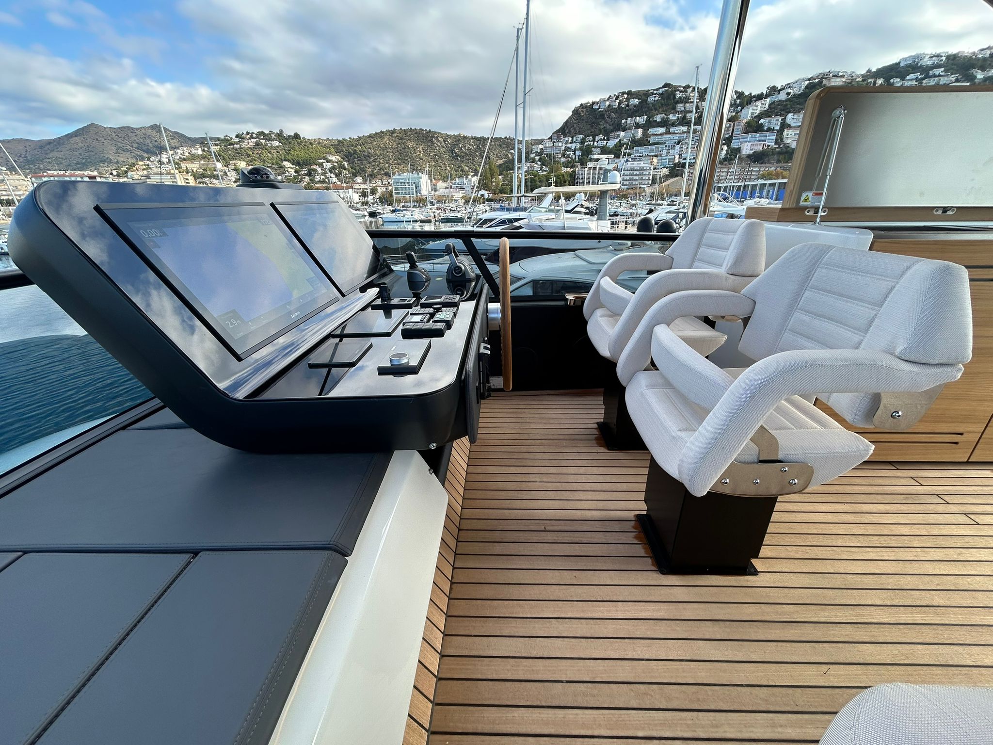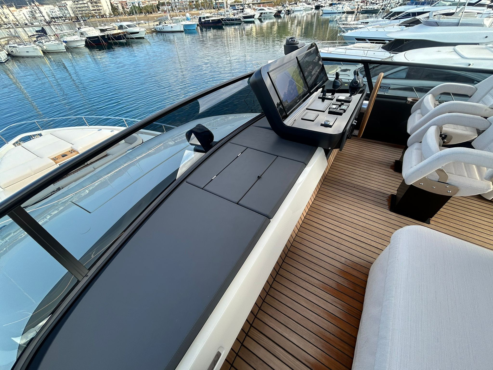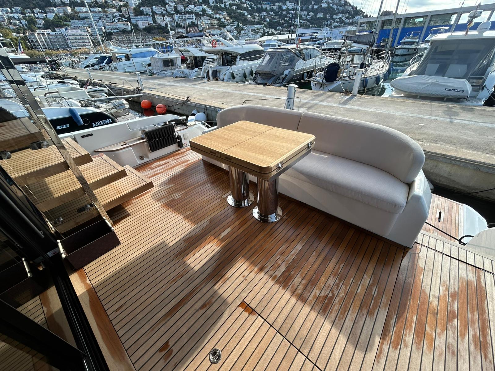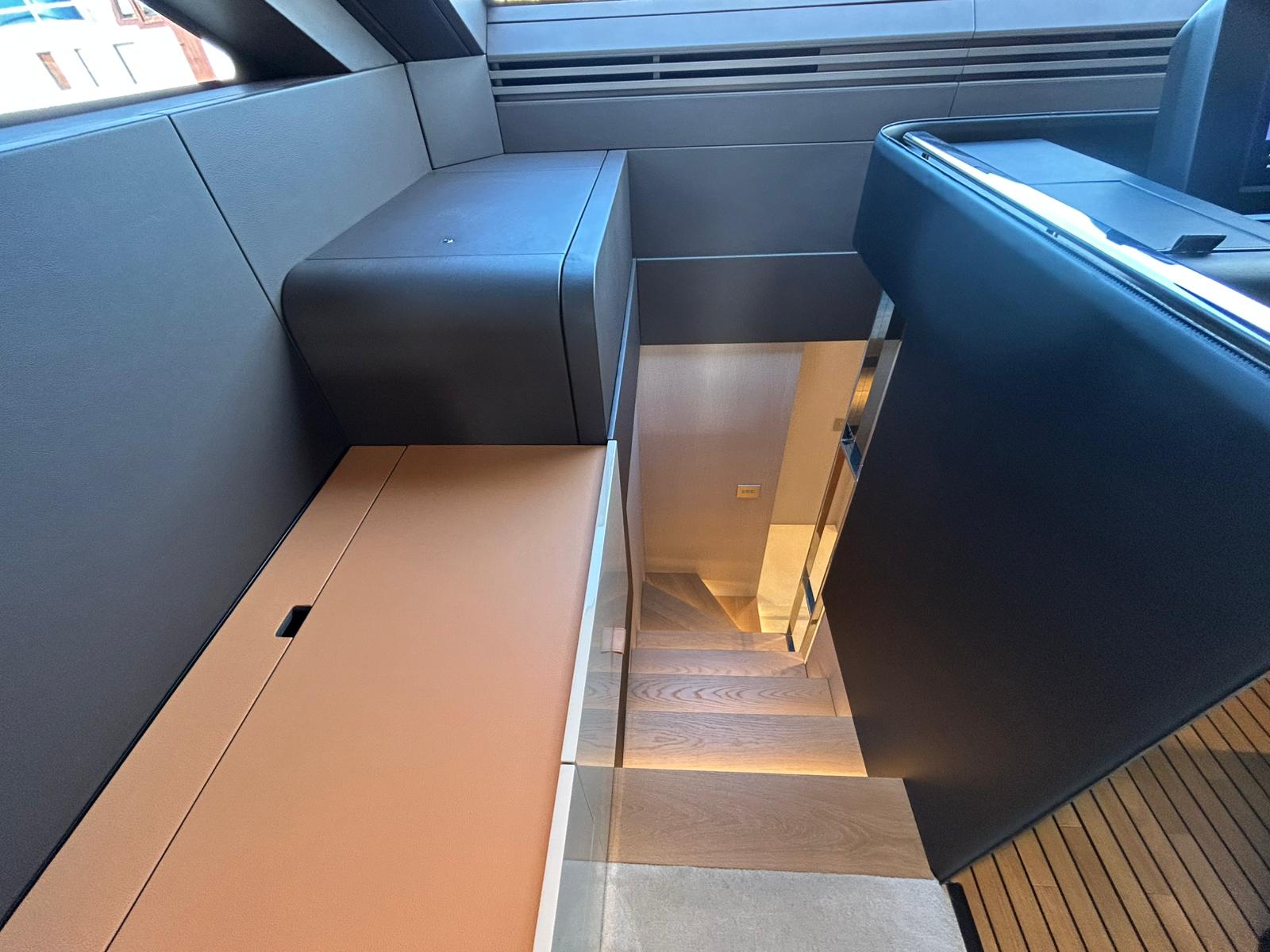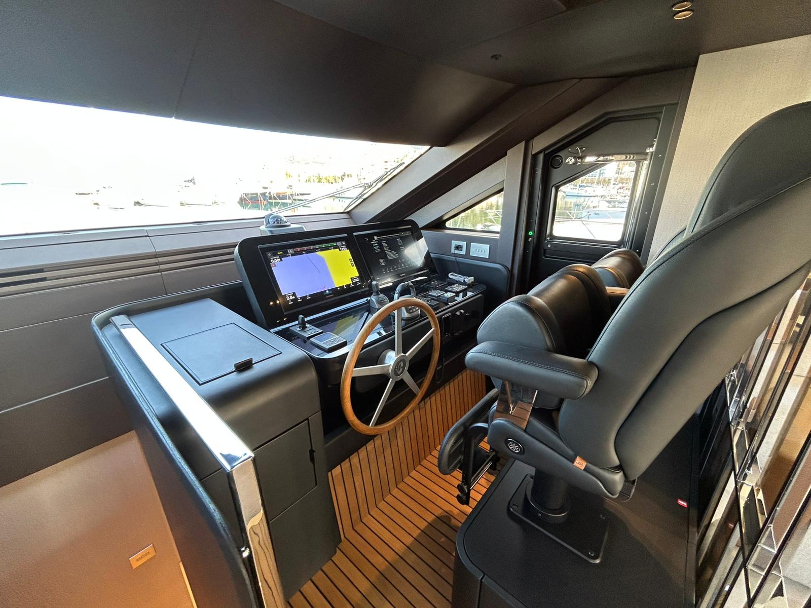 Àncora 60 Kg Ultramarine en acer inoxidable i cadena d'acer inoxidable de 100 m - Enrotlladors elèctrics cable línea de moll de 20 m amb comandament a distància - Zona de platja a popa: dutxa amb ràdio, llums i carregador inalàmbric per smartphone - Lli per 3 camarots i cabina mariner: set de llençols, fundes de coixí, funda de matalàs, cobrellit, tovalloles, etc. - Bidet al bany de la cabina de l'armador - Bimini top de proa amb pals de carboni - Caixaforta electrònica a la cabina de l'armador - 6 caps d'amarratge - Cobertura per dinette a la banyera de popa - Cobertures flybridge - Desalinitzadora 160 l/h amb comandament a la cabina i sistema rentat amb aigua dolça - Hèlix de proa proporcional - Far pirata - Nevera al sofà del matalàs de proa - Suplement generador de 20,5 kW - Tercer lloc de comandament a la banyera - Màquina de gel amb tanc d'aigua separat - Rentadora i assecadora Miele - 7 Llums subaquàtiques (3 a popa i 2 a cada costat) - Obscurants per vidres de proa i laterals - Bimini top de popa vertical - Escotilla elèctrica a la timoneria - Psasarel·la hidràulica telescòpica retràctil - Fin Stabilizations System Humphree - Seient interior copilot - Porta d'accés lateral a popa estribord - Porta d'accés lateral a popa babord - Segona pantalla plotter 22" al flybridge - Segona pantalla plotter 22" a la coberta principal - Set de vaixella, gots i coberts per 6 persones - Estabilitzador giroscòpic Seakeeper 9 - Surround view camera system Garmin - Superfície de teca als trancanils laterals proa/popa - Teca al flybridge - Tendal de popa elèctrico al flybridge - T-Top flybridge amb làmines d'obertura elèctrica - TV LED al saló amb dispositiu elèctric retràctil i sistema Home Theatre - TV 55" LED a la cabina de l'armador y ràdio Bluetooth/USB - TV 43" LED a la cabina VIP i ràdio Bluetooth/USB - Certificat CE i declaració de conformitat - Transport, muntatge amb avarada i control general al Cranchi Marine Test Centre a Venècia - Suplement transport T-Top - Decoració interior "Amalfi": combinació de colors dels mobles, sòls de fusta, teixits i marbres - Pintura de la línea de bellesa al casc de color negre - T-Top lacat negre - 2 Cúpules buides per antena satèl·lit TV6/60 cm.