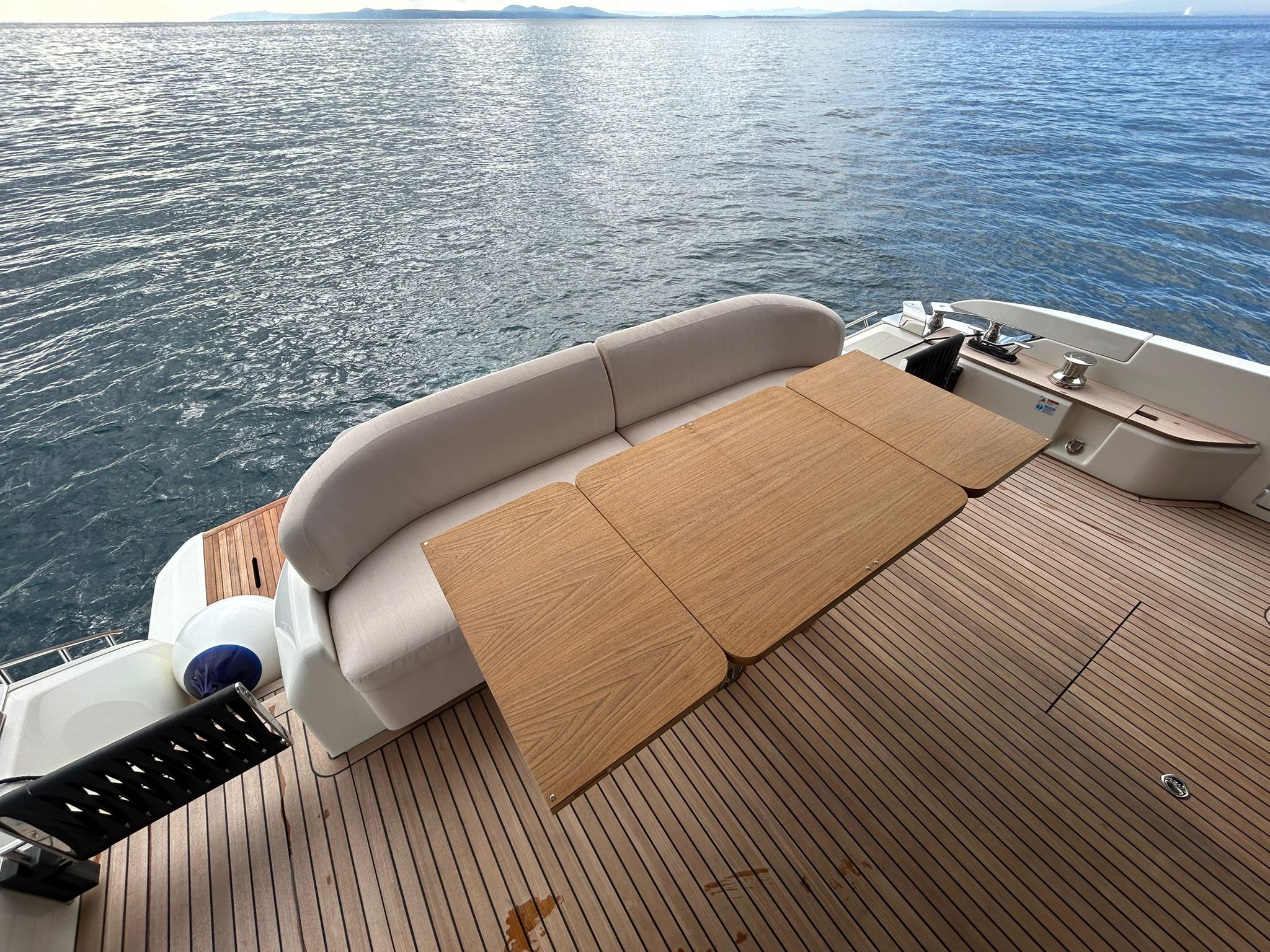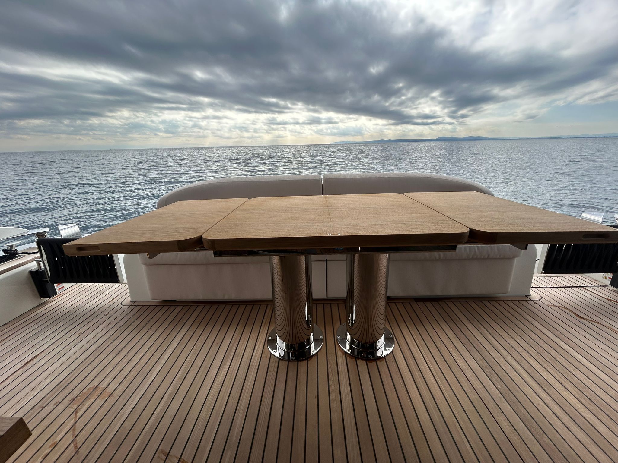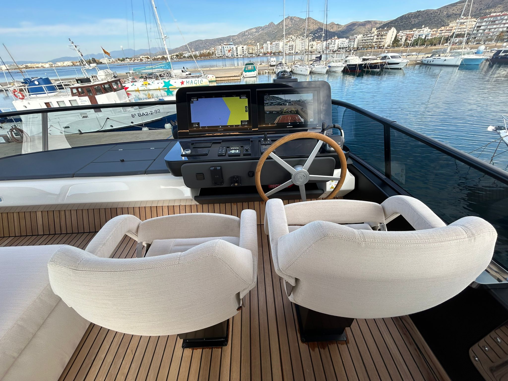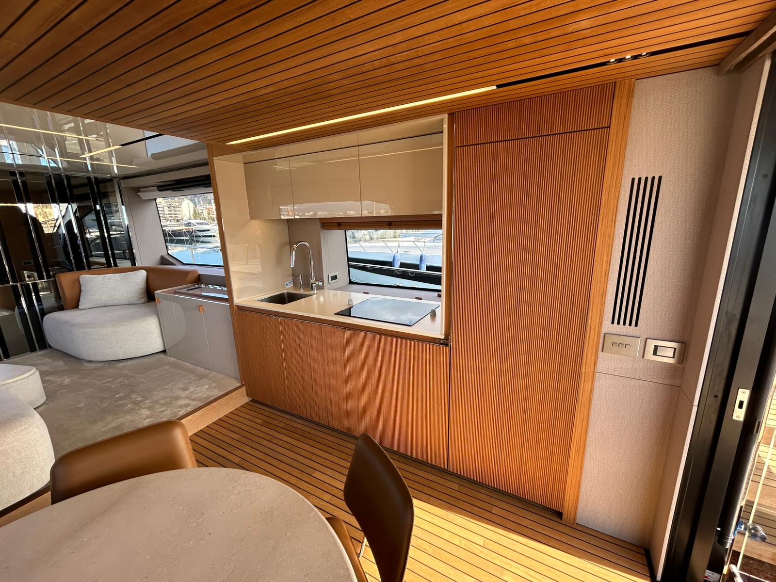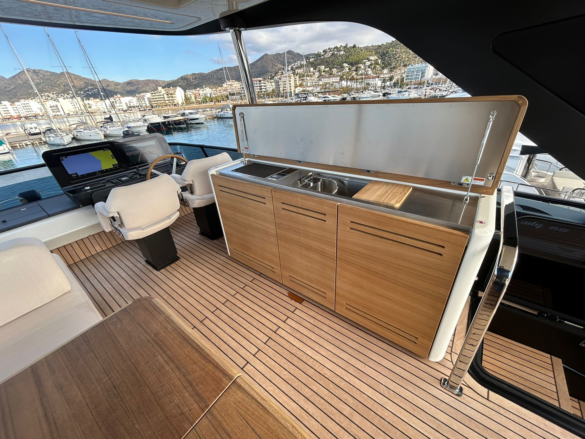 Àncora 60 Kg Ultramarine en acer inoxidable i cadena d'acer inoxidable de 100 m - Enrotlladors elèctrics cable línea de moll de 20 m amb comandament a distància - Zona de platja a popa: dutxa amb ràdio, llums i carregador inalàmbric per smartphone - Lli per 3 camarots i cabina mariner: set de llençols, fundes de coixí, funda de matalàs, cobrellit, tovalloles, etc. - Bidet al bany de la cabina de l'armador - Bimini top de proa amb pals de carboni - Caixaforta electrònica a la cabina de l'armador - 6 caps d'amarratge - Cobertura per dinette a la banyera de popa - Cobertures flybridge - Desalinitzadora 160 l/h amb comandament a la cabina i sistema rentat amb aigua dolça - Hèlix de proa proporcional - Far pirata - Nevera al sofà del matalàs de proa - Suplement generador de 20,5 kW - Tercer lloc de comandament a la banyera - Màquina de gel amb tanc d'aigua separat - Rentadora i assecadora Miele - 7 Llums subaquàtiques (3 a popa i 2 a cada costat) - Obscurants per vidres de proa i laterals - Bimini top de popa vertical - Escotilla elèctrica a la timoneria - Psasarel·la hidràulica telescòpica retràctil - Fin Stabilizations System Humphree - Seient interior copilot - Porta d'accés lateral a popa estribord - Porta d'accés lateral a popa babord - Segona pantalla plotter 22" al flybridge - Segona pantalla plotter 22" a la coberta principal - Set de vaixella, gots i coberts per 6 persones - Estabilitzador giroscòpic Seakeeper 9 - Surround view camera system Garmin - Superfície de teca als trancanils laterals proa/popa - Teca al flybridge - Tendal de popa elèctrico al flybridge - T-Top flybridge amb làmines d'obertura elèctrica - TV LED al saló amb dispositiu elèctric retràctil i sistema Home Theatre - TV 55" LED a la cabina de l'armador y ràdio Bluetooth/USB - TV 43" LED a la cabina VIP i ràdio Bluetooth/USB - Certificat CE i declaració de conformitat - Transport, muntatge amb avarada i control general al Cranchi Marine Test Centre a Venècia - Suplement transport T-Top - Decoració interior "Amalfi": combinació de colors dels mobles, sòls de fusta, teixits i marbres - Pintura de la línea de bellesa al casc de color negre - T-Top lacat negre - 2 Cúpules buides per antena satèl·lit TV6/60 cm.
