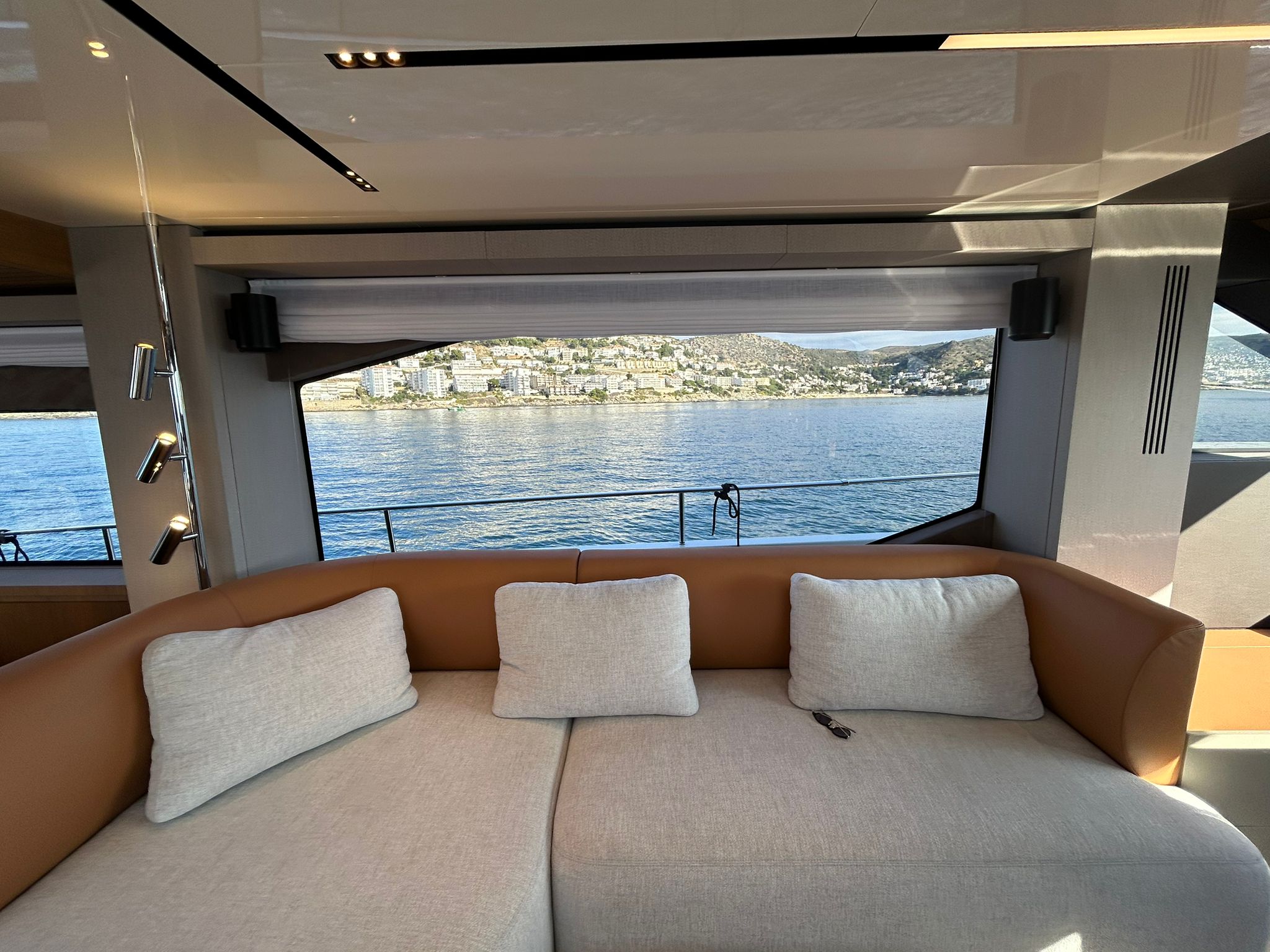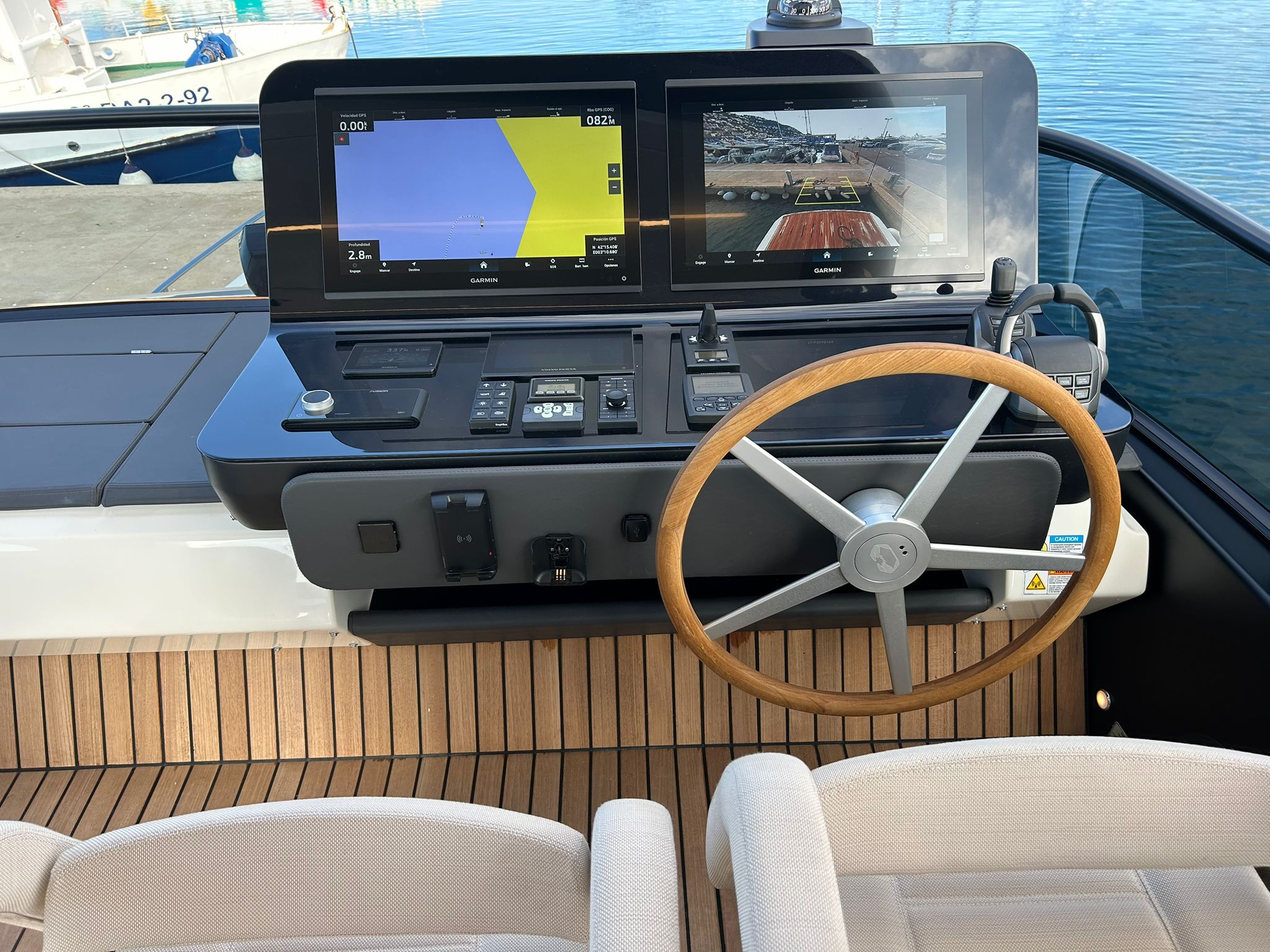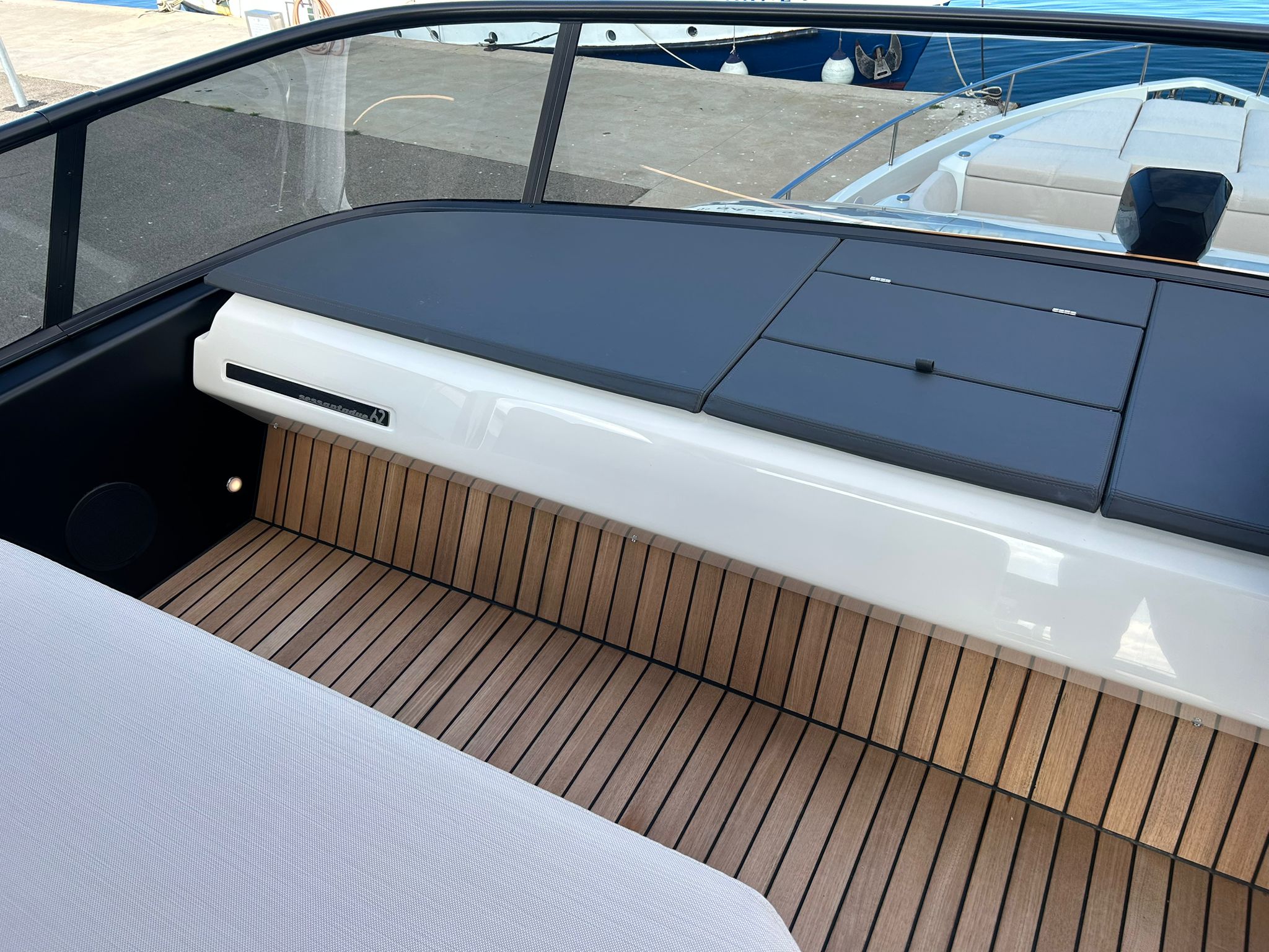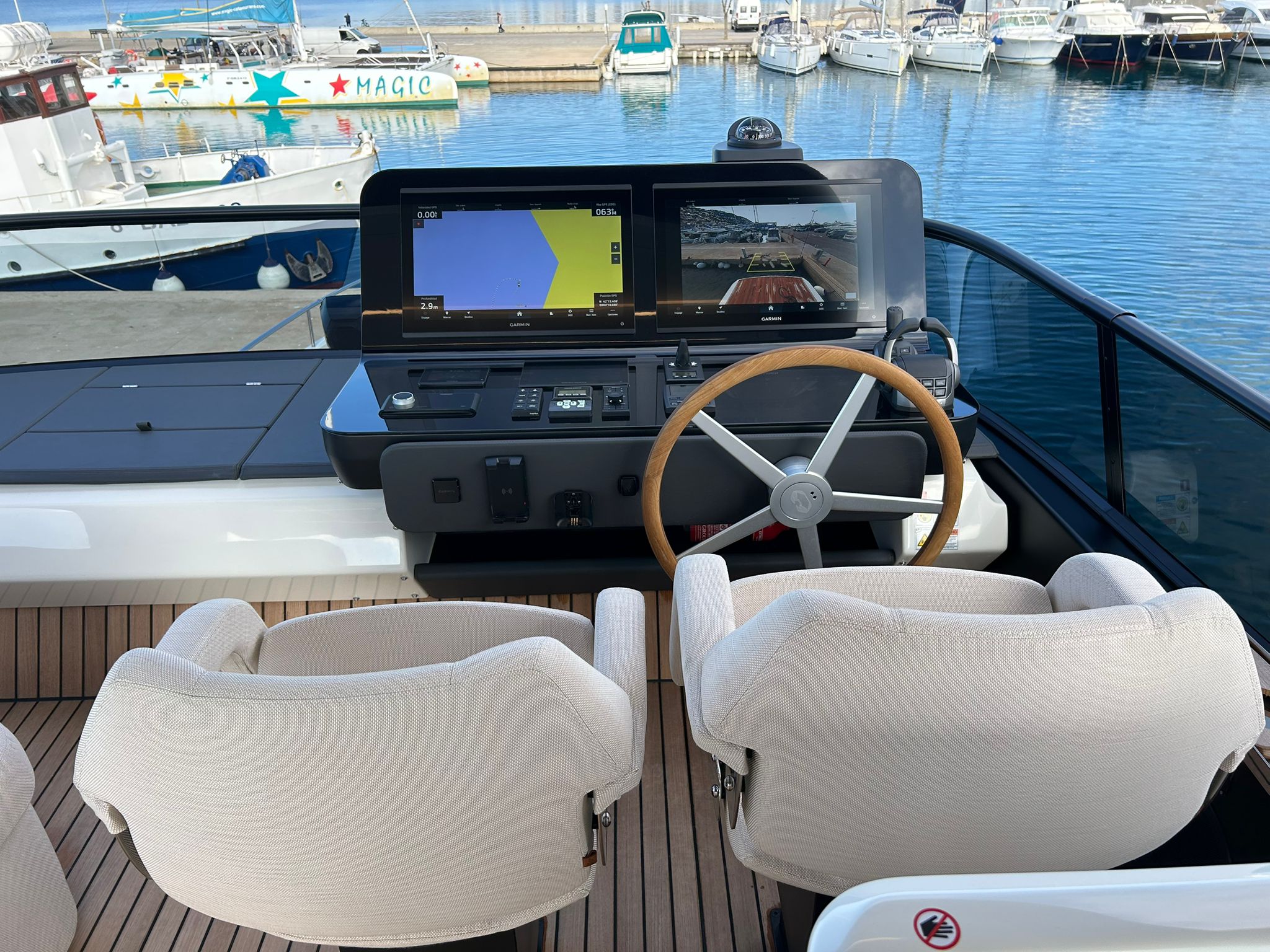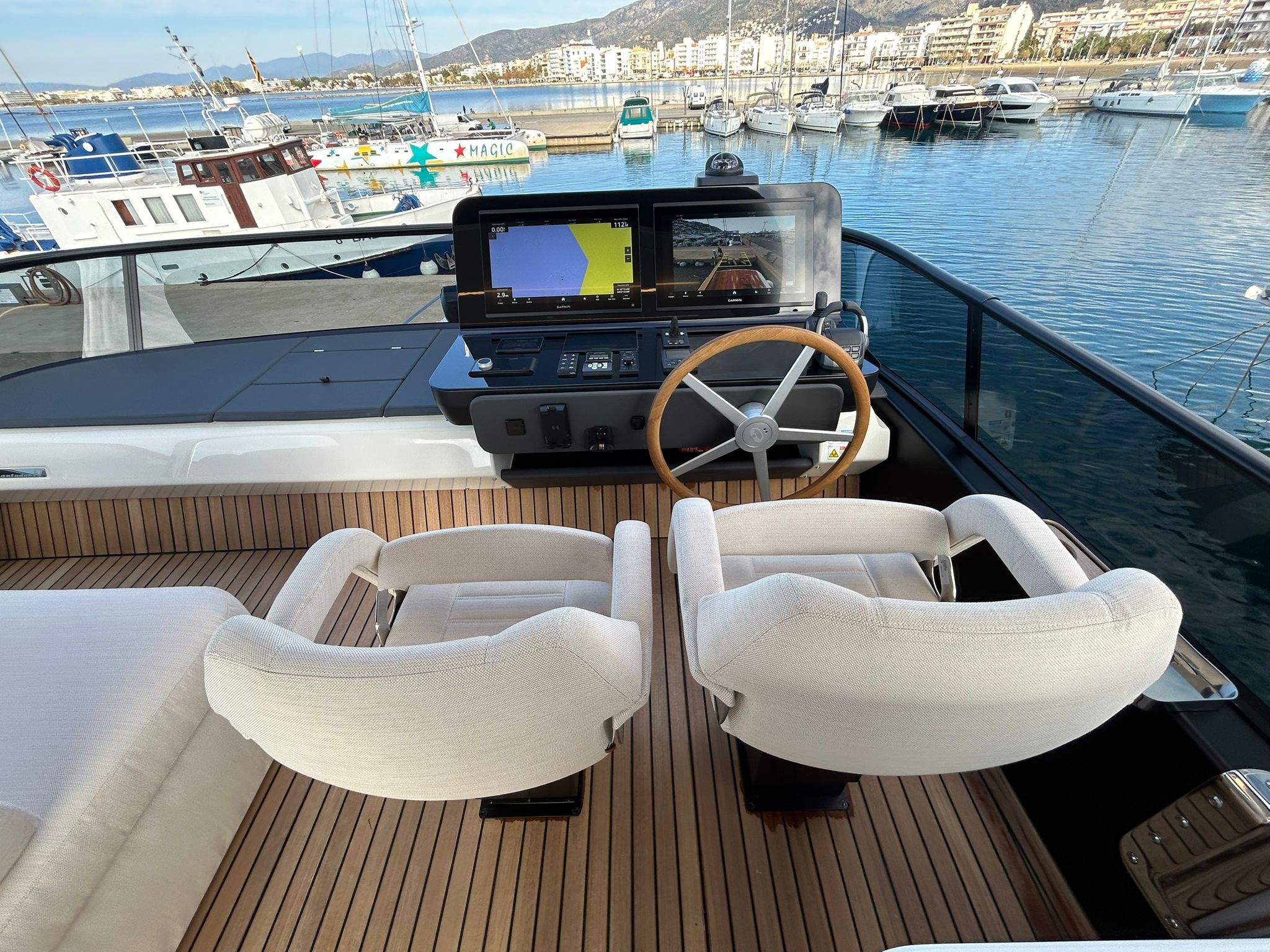 Àncora 60 Kg Ultramarine en acer inoxidable i cadena d'acer inoxidable de 100 m - Enrotlladors elèctrics cable línea de moll de 20 m amb comandament a distància - Zona de platja a popa: dutxa amb ràdio, llums i carregador inalàmbric per smartphone - Lli per 3 camarots i cabina mariner: set de llençols, fundes de coixí, funda de matalàs, cobrellit, tovalloles, etc. - Bidet al bany de la cabina de l'armador - Bimini top de proa amb pals de carboni - Caixaforta electrònica a la cabina de l'armador - 6 caps d'amarratge - Cobertura per dinette a la banyera de popa - Cobertures flybridge - Desalinitzadora 160 l/h amb comandament a la cabina i sistema rentat amb aigua dolça - Hèlix de proa proporcional - Far pirata - Nevera al sofà del matalàs de proa - Suplement generador de 20,5 kW - Tercer lloc de comandament a la banyera - Màquina de gel amb tanc d'aigua separat - Rentadora i assecadora Miele - 7 Llums subaquàtiques (3 a popa i 2 a cada costat) - Obscurants per vidres de proa i laterals - Bimini top de popa vertical - Escotilla elèctrica a la timoneria - Psasarel·la hidràulica telescòpica retràctil - Fin Stabilizations System Humphree - Seient interior copilot - Porta d'accés lateral a popa estribord - Porta d'accés lateral a popa babord - Segona pantalla plotter 22" al flybridge - Segona pantalla plotter 22" a la coberta principal - Set de vaixella, gots i coberts per 6 persones - Estabilitzador giroscòpic Seakeeper 9 - Surround view camera system Garmin - Superfície de teca als trancanils laterals proa/popa - Teca al flybridge - Tendal de popa elèctrico al flybridge - T-Top flybridge amb làmines d'obertura elèctrica - TV LED al saló amb dispositiu elèctric retràctil i sistema Home Theatre - TV 55" LED a la cabina de l'armador y ràdio Bluetooth/USB - TV 43" LED a la cabina VIP i ràdio Bluetooth/USB - Certificat CE i declaració de conformitat - Transport, muntatge amb avarada i control general al Cranchi Marine Test Centre a Venècia - Suplement transport T-Top - Decoració interior "Amalfi": combinació de colors dels mobles, sòls de fusta, teixits i marbres - Pintura de la línea de bellesa al casc de color negre - T-Top lacat negre - 2 Cúpules buides per antena satèl·lit TV6/60 cm.