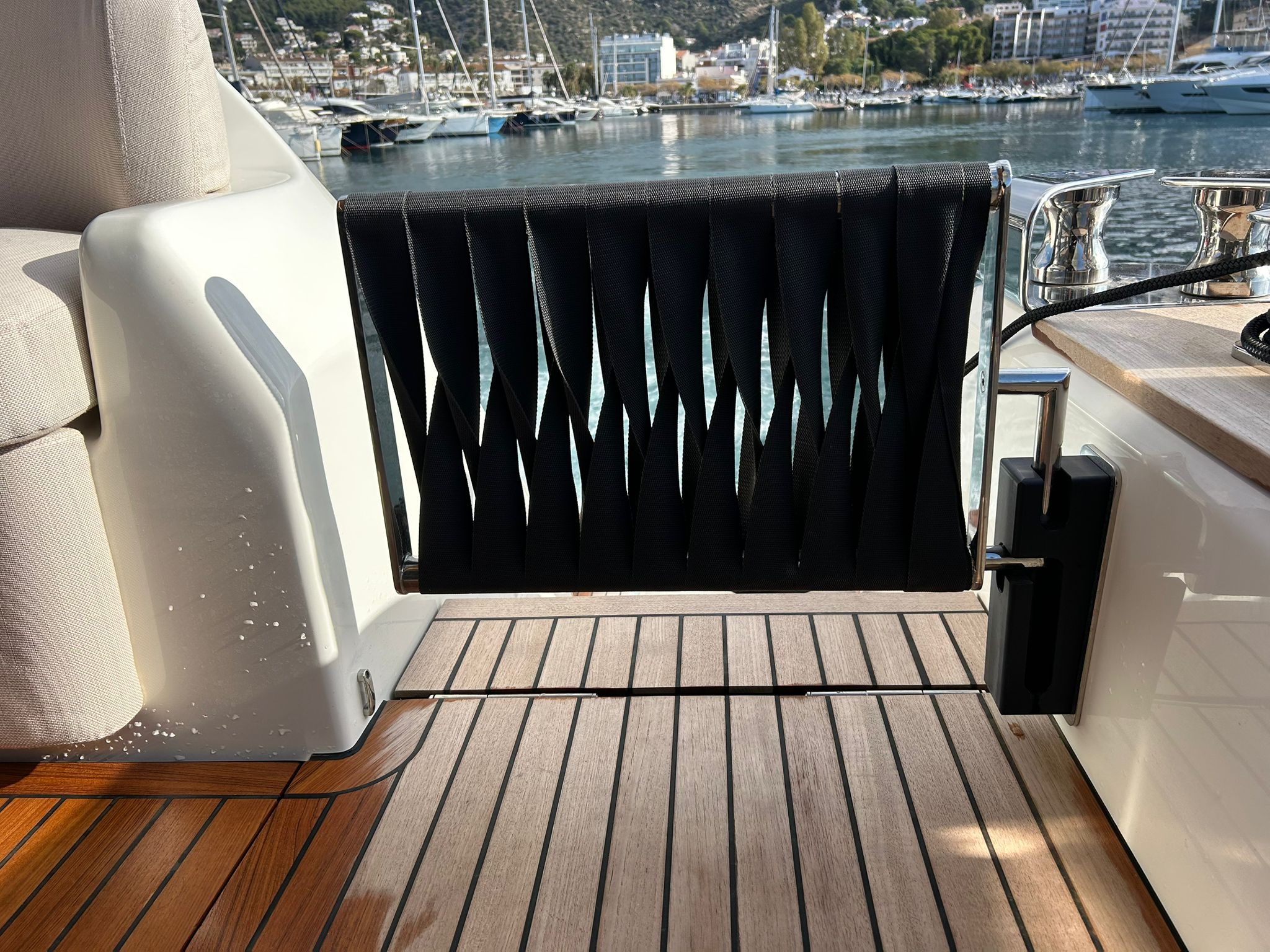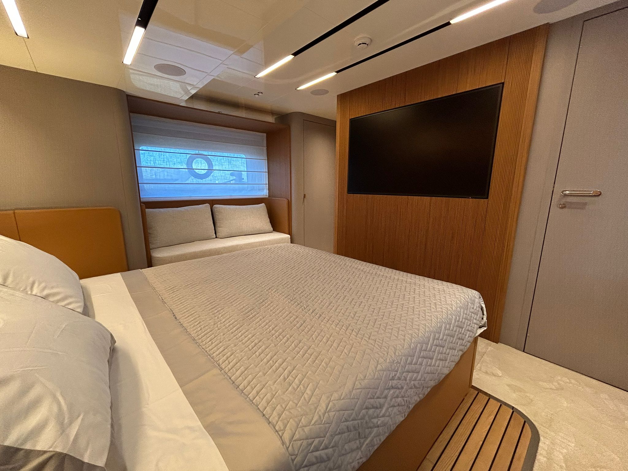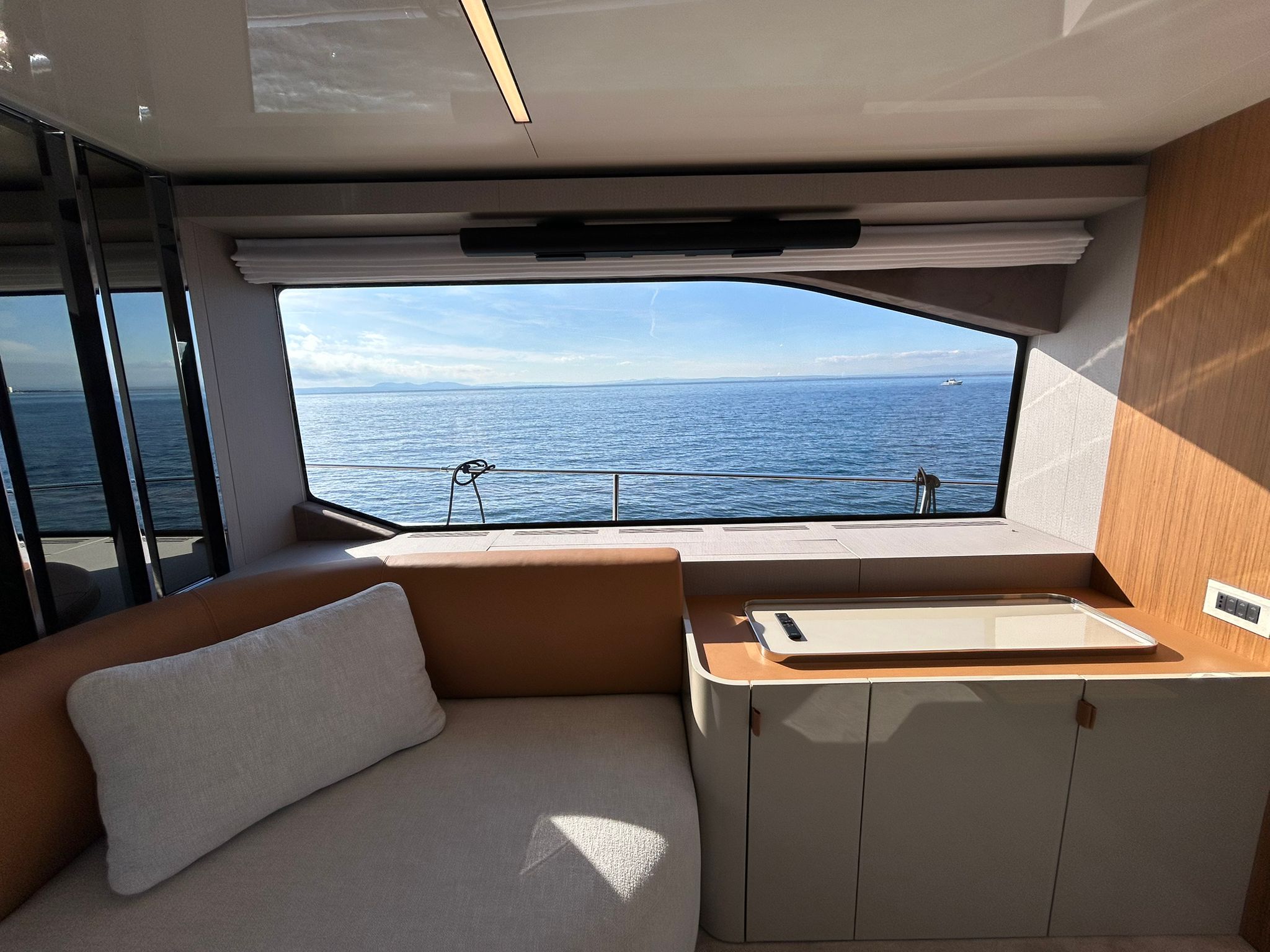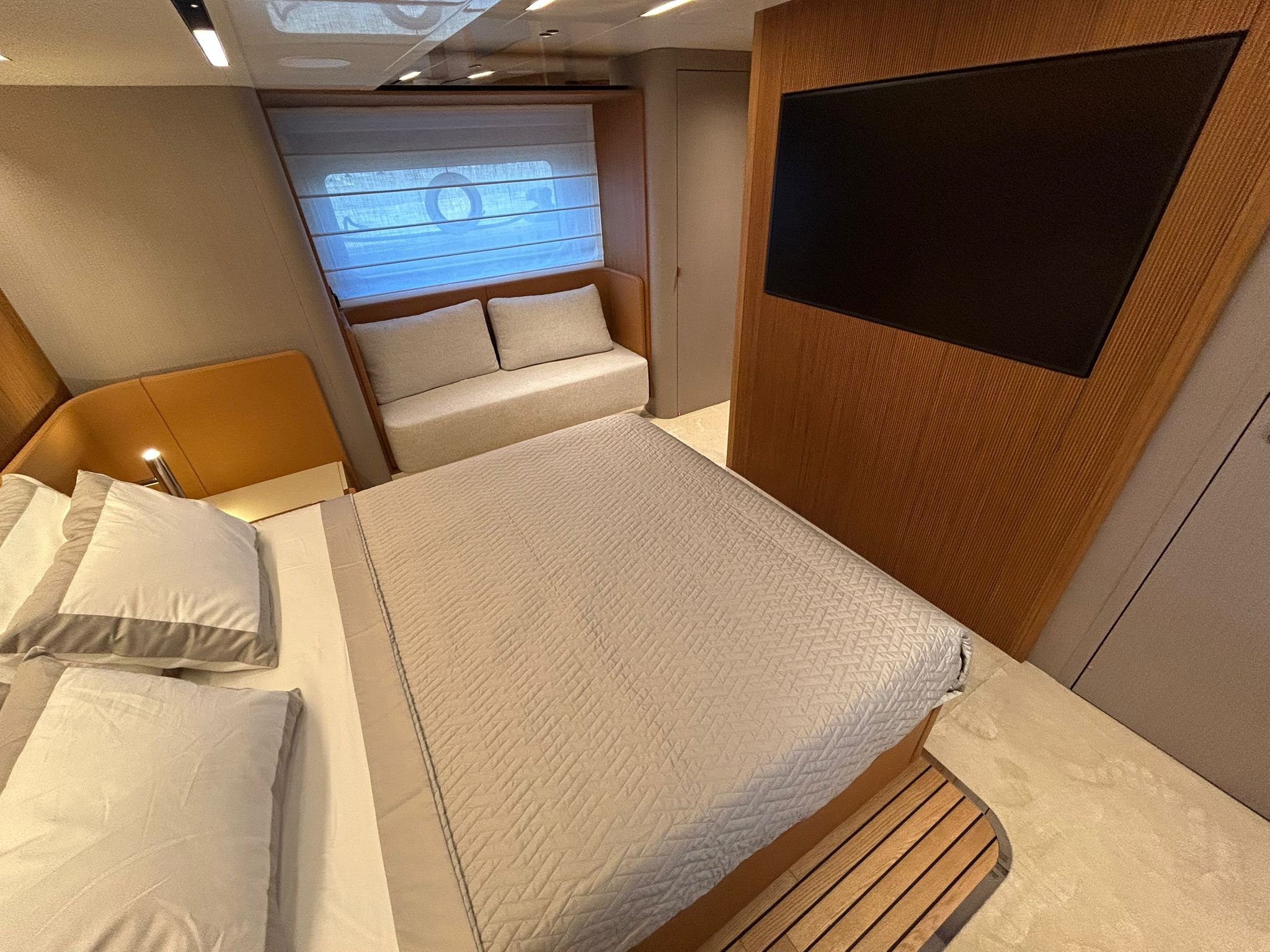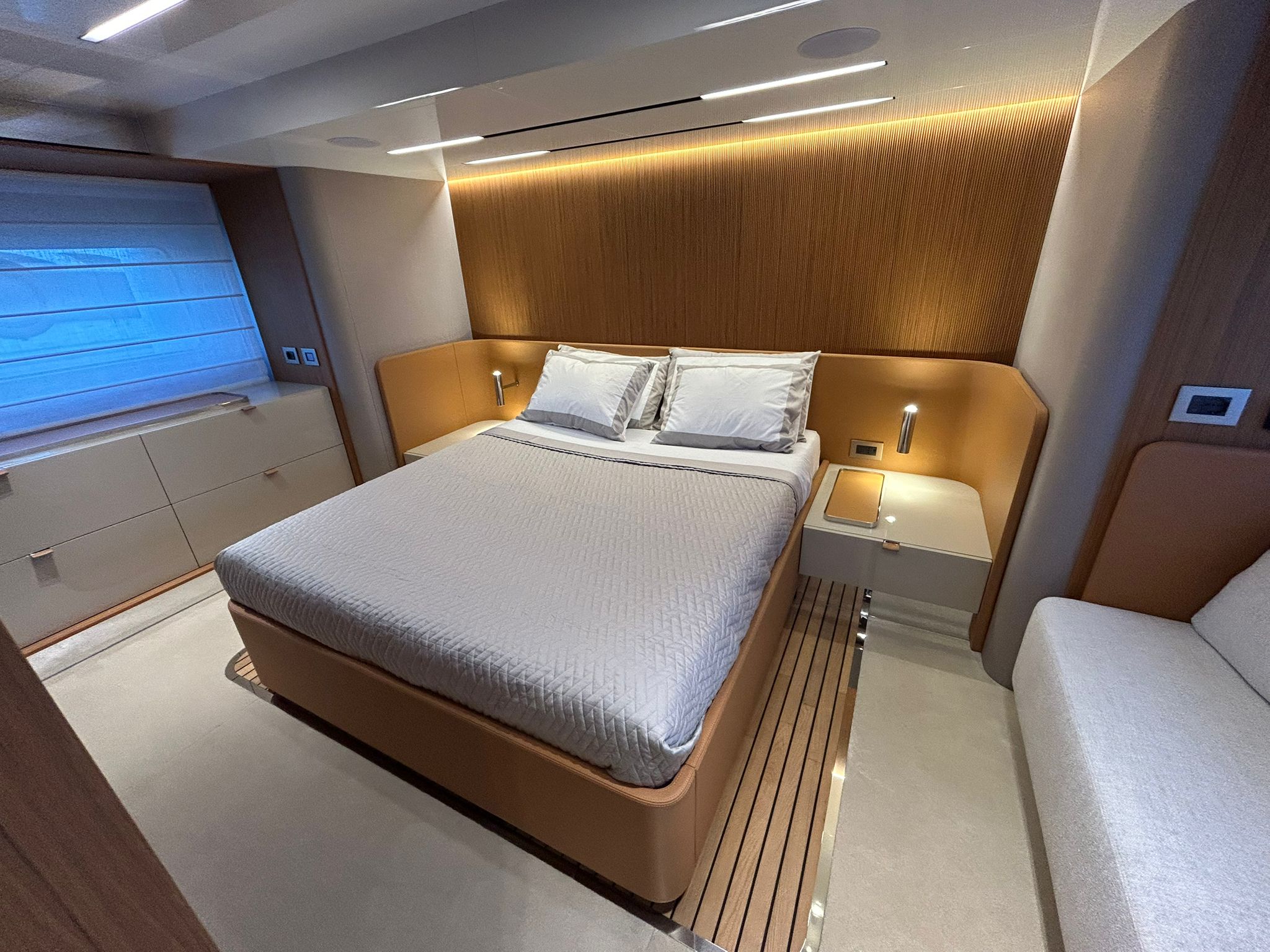 Àncora 60 Kg Ultramarine en acer inoxidable i cadena d'acer inoxidable de 100 m - Enrotlladors elèctrics cable línea de moll de 20 m amb comandament a distància - Zona de platja a popa: dutxa amb ràdio, llums i carregador inalàmbric per smartphone - Lli per 3 camarots i cabina mariner: set de llençols, fundes de coixí, funda de matalàs, cobrellit, tovalloles, etc. - Bidet al bany de la cabina de l'armador - Bimini top de proa amb pals de carboni - Caixaforta electrònica a la cabina de l'armador - 6 caps d'amarratge - Cobertura per dinette a la banyera de popa - Cobertures flybridge - Desalinitzadora 160 l/h amb comandament a la cabina i sistema rentat amb aigua dolça - Hèlix de proa proporcional - Far pirata - Nevera al sofà del matalàs de proa - Suplement generador de 20,5 kW - Tercer lloc de comandament a la banyera - Màquina de gel amb tanc d'aigua separat - Rentadora i assecadora Miele - 7 Llums subaquàtiques (3 a popa i 2 a cada costat) - Obscurants per vidres de proa i laterals - Bimini top de popa vertical - Escotilla elèctrica a la timoneria - Psasarel·la hidràulica telescòpica retràctil - Fin Stabilizations System Humphree - Seient interior copilot - Porta d'accés lateral a popa estribord - Porta d'accés lateral a popa babord - Segona pantalla plotter 22" al flybridge - Segona pantalla plotter 22" a la coberta principal - Set de vaixella, gots i coberts per 6 persones - Estabilitzador giroscòpic Seakeeper 9 - Surround view camera system Garmin - Superfície de teca als trancanils laterals proa/popa - Teca al flybridge - Tendal de popa elèctrico al flybridge - T-Top flybridge amb làmines d'obertura elèctrica - TV LED al saló amb dispositiu elèctric retràctil i sistema Home Theatre - TV 55" LED a la cabina de l'armador y ràdio Bluetooth/USB - TV 43" LED a la cabina VIP i ràdio Bluetooth/USB - Certificat CE i declaració de conformitat - Transport, muntatge amb avarada i control general al Cranchi Marine Test Centre a Venècia - Suplement transport T-Top - Decoració interior "Amalfi": combinació de colors dels mobles, sòls de fusta, teixits i marbres - Pintura de la línea de bellesa al casc de color negre - T-Top lacat negre - 2 Cúpules buides per antena satèl·lit TV6/60 cm.