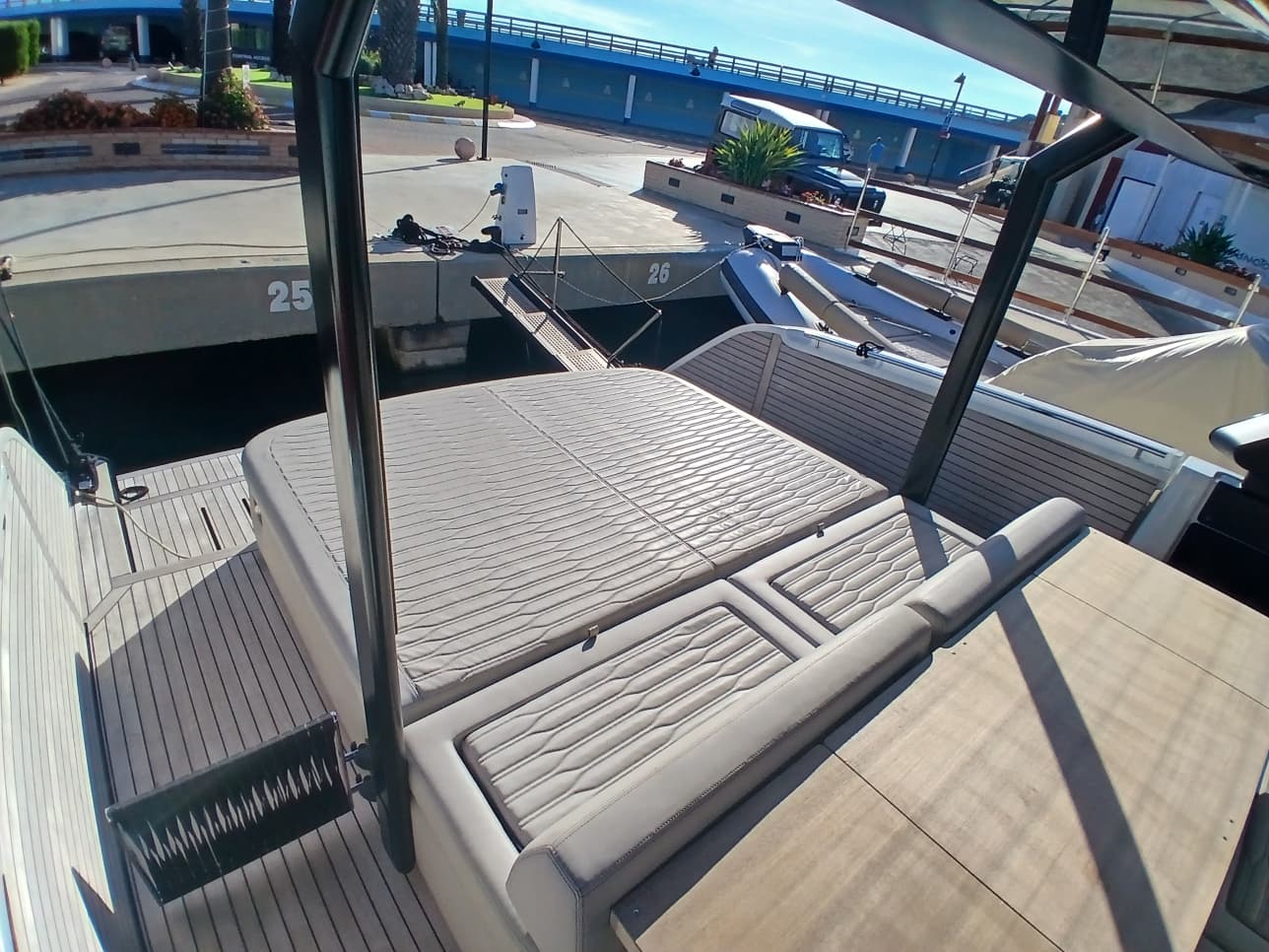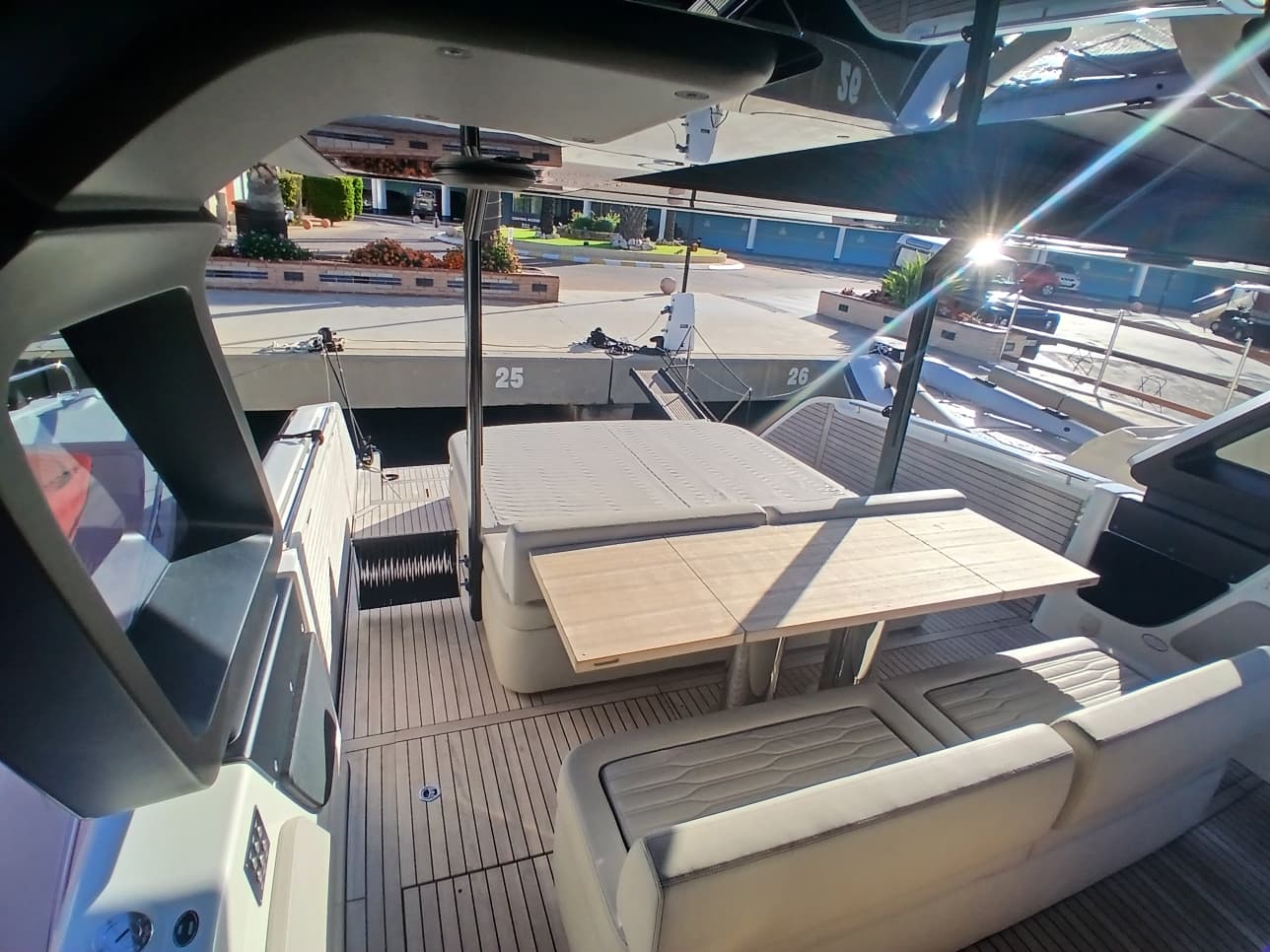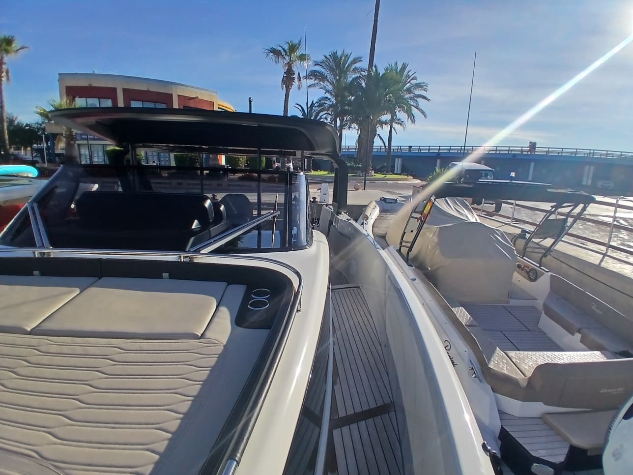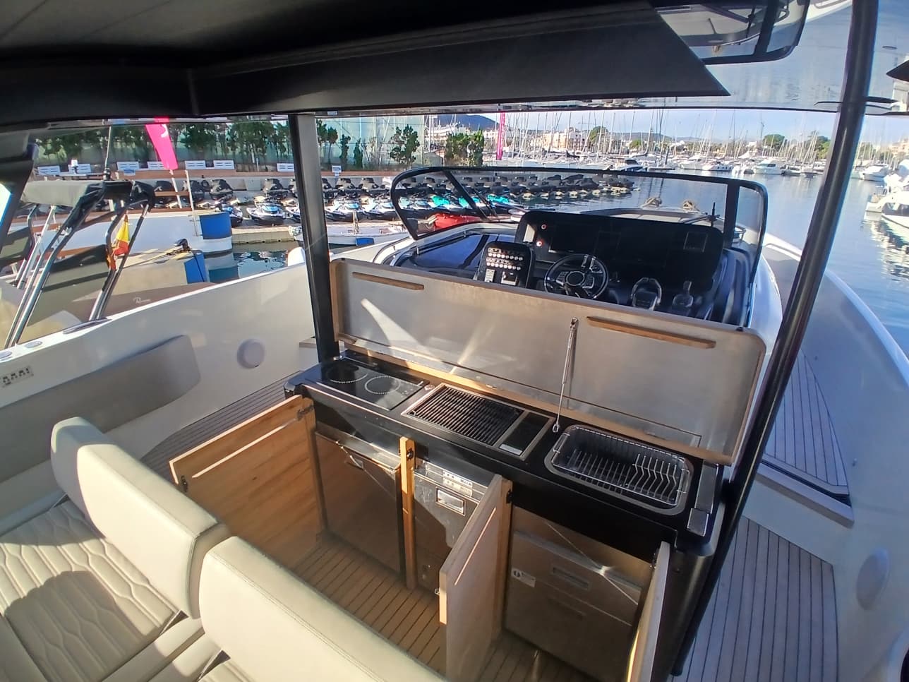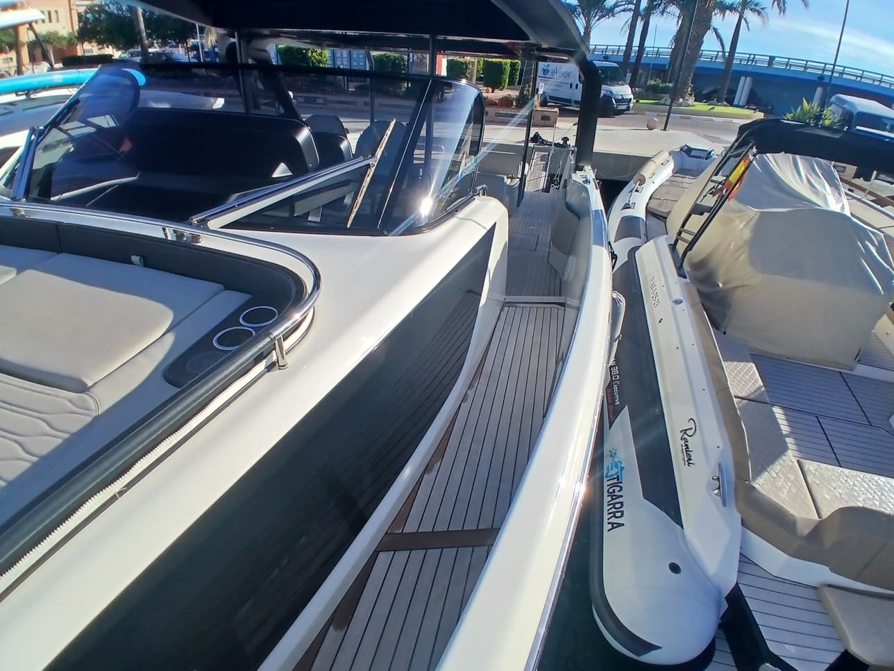 Waste water tank - Air conditioning 16.000 BTU in cabins with heat pump - Set covers (for dashboard, pilot seat, stern sofa, cockpit table, cockpit wetbar and stern sun cushion) - Automatic List Control + Coordinated Turn Control - Bow thruster - Cockpit refrigerator - Generator 8 kW - Electric cockpit grill - Ice-maker - Aft lowering bulkwarks - Hydraulic gangway - Autopilot - Up/down hydraulic stern platform - Teak laid cockpit and teak laid aft lowering bulkwarks - Solid teak coverings on lateral stringers - T-Top - VHF - CE Certificate - Stern band (side and platform frame) lacquered - T-Top lacquered - Preparation, launch and delivery with sea trial - Transport shipyard to Costa Brava.