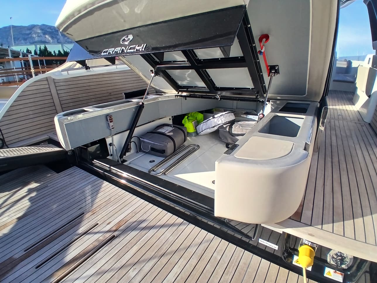 Boat in stock. Immediate delivery. Model A 46 Luxury Tender of the italian shipyard Cranchi of 14,25 meters in total length. Boat with hard top and spacious aft sundeck. Modern interiors and great habitability.
