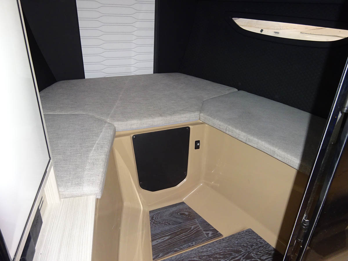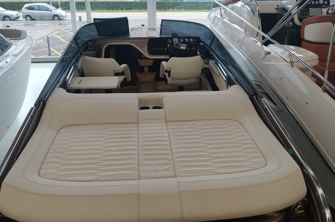 Waste water tank - Bimini top black microperforated - Bow thruster with automatic fire extinguisher - Cabin refrigerator 42 l - GPS/Colour Chartplotter + transducer depth, water temperature, interfaced with the engine - 230 V electric wiring system with battery charger and shore power with cable - 2 Underwater lights - 6 Fenders and covers - Radio Fusion Bluetooth/USB, 2 speakers, amplifier, subwoofer and remote control in the cockpit - Cockpit table with cover - Partial foredeck teak laid - Teak laid cockpit - Cockpit cover - 500 W electric anchor winch with 30 m chain and 8 kg Ultramarine stainless steel anchor - Electric marine WC with cover - Fender covers alternative colour to standard one - Exterior upholstery Silvertex alternative colour to standard one - Hull and deck colour lacquered - Matt protective coating for cockpit teak table - CE certificate and declaration of conformity - Transport shipyard to Costa Brava.