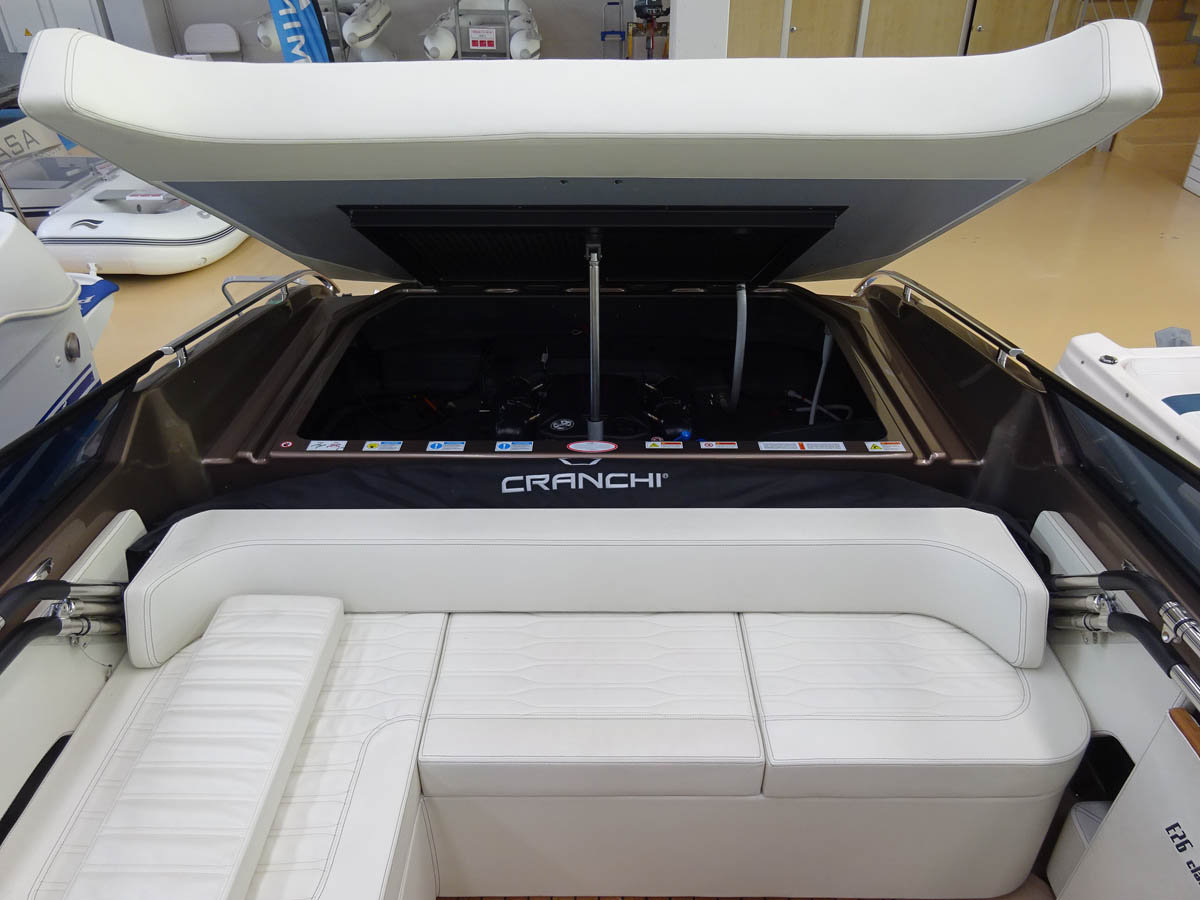 New boat in stock. Delivery in January 2026. Stock photos, colours and equipment may not correspond exactly to the offered unit. Model E 26 Classic of the italian shipyard Cranchi of 7,85 meters in total length. Boat with comfortable bathing platform, spacious layout, with cabin and aft sundeck.